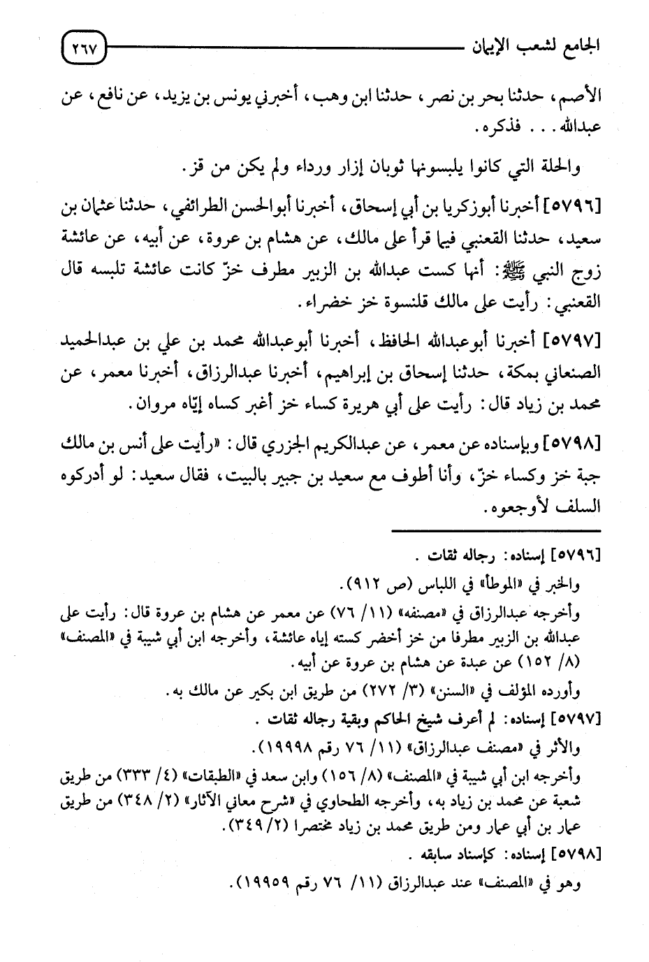 5798 - وَبِإِسْنَادِهِ عَنْ مَعْمَرٍ، عَنْ عَبْدِ الْكَرِيمِ الْجَزَرِيِّ قَالَ: " رَأَيْتُ عَلَى أَنَسِ بْنِ مَالِكٍ §جُبَّةَ خَزٍّ، وَكِسَاءَ خَزٍّ وَأَنَا أَطُوفُ مَعَ سَعِيدِ بْنِ جُبَيْرٍ بِالْبَيْتِ، فَقَالَ سَعِيدٌ: لَوْ أَدْرَكُوهُ السَّلَفُ لَأَوْجَعُوهُ "