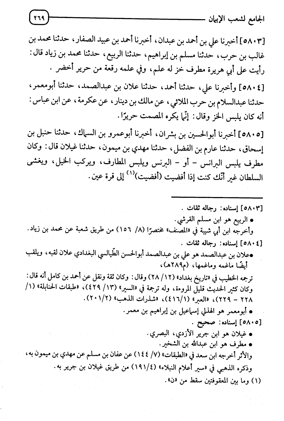 5805 - أَخْبَرَنَا أَبُو الْحُسَيْنِ بْنُ بِشْرَانَ، أَنَا أَبُو عَمْرِو بْنُ السَّمَّاكِ، ثَنَا حَنْبَلُ بْنُ إِسْحَاقَ، ثَنَا عَارِمُ بْنُ الْفَضْلِ، ثَنَا مَهْدِيُّ بْنُ مَيْمُونٍ، ثَنَا غَيْلَانُ قَالَ: " وَكَانَ مُطَرِّفٌ §يَلْبَسُ الْبَرَانِسَ أَوِ الْبُرْنُسَ وَيَلْبَسُ الْمَطَارِفَ وَيَرْكَبُ الْخَيْلَ وَيُغْشَى السُّلْطَانَ غَيْرَ أَنَّكَ كُنْتَ إِذَا أَفْضَيْتَ أَمْضَيْتَ إِلَى قُرَّةِ عَيْنٍ "