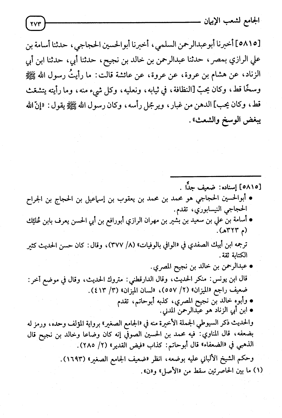 5815 - أَخْبَرَنَا أَبُو عَبْدِ الرَّحْمَنِ السُّلَمِيُّ، أَنَا الْحُسَيْنُ الْحُجَاجِيُّ، ثَنَا أُسَامَةُ بْنُ عَلِيٍّ الرَّازِيُّ، بِمِصْرَ، ثَنَا عَبْدُ الرَّحْمَنِ بْنُ خَالِدِ بْنِ نَجِيحٍ، ثَنَا أَبِي، ثَنَا ابْنُ أَبِي الزِّنَادِ، عَنْ هِشَامِ بْنِ عُرْوَةَ، عَنْ عُرْوَةَ، عَنْ عَائِشَةَ قَالَتْ: مَا رَأَيْتُ رَسُولَ اللهِ صَلَّى اللَّهُ عَلَيْهِ وَسَلَّمَ وَسِخًا قَطُّ كَانَ يُحِبُّ الدُّهْنَ غِبًّا وَيُرَجِّلُ رَأْسَهُ وَكَانَ رَسُولُ اللهِ صَلَّى اللَّهُ عَلَيْهِ وَسَلَّمَ يَقُولُ: " إِنَّ §اللهَ يُبْغِضُ الْوَسَخَ وَالشَّعَثَ "