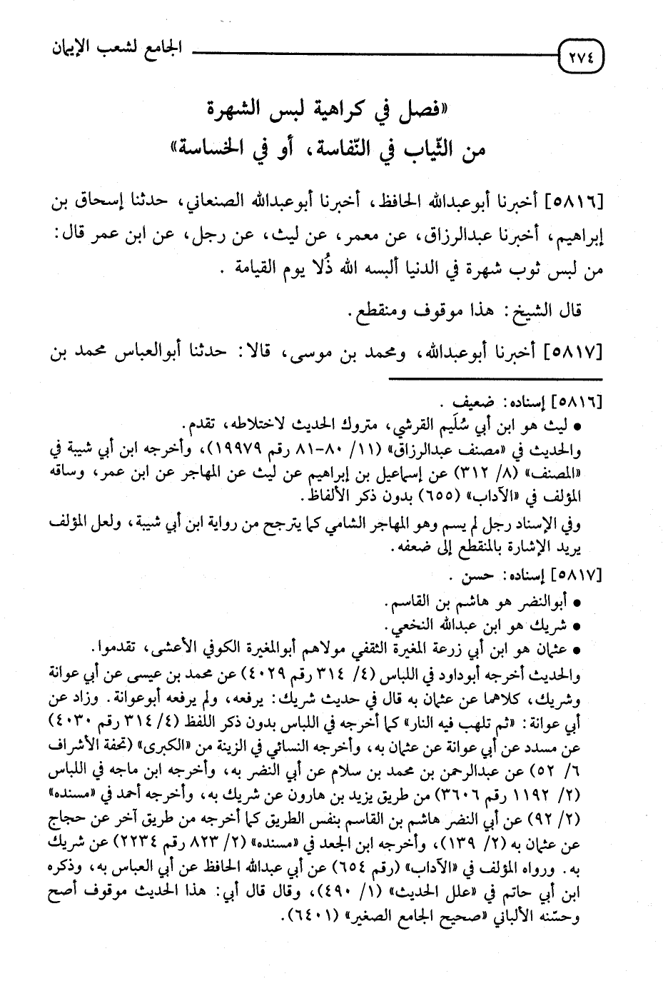 5817 - أَخْبَرَنَا أَبُو عَبْدِ اللهِ الْحَافِظُ، وَمُحَمَّدُ بْنُ مُوسَى، ثَنَا أَبُو الْعَبَّاسِ مُحَمَّدُ بْنُ -[275]- يَعْقُوبَ، ثَنَا الْعَبَّاسُ بْنُ مُحَمَّدٍ الدُّورِيُّ، ثَنَا أَبُو النَّصْرِ، عَنْ شَرِيكٍ، عَنْ عُثْمَانَ، عَنْ مُهَاجِرٍ الشَّامِيِّ، عَنِ ابْنِ عُمَرَ قَالَ: قَالَ رَسُولُ اللهِ صَلَّى اللَّهُ عَلَيْهِ وَسَلَّمَ: §" مَنْ لَبِسَ ثَوْبَ شُهْرَةٍ فِي الدُّنْيَا أَلْبَسَهُ اللهُ ثَوْبَ مَذَلَّةٍ يَوْمَ الْقِيَامَةِ "
