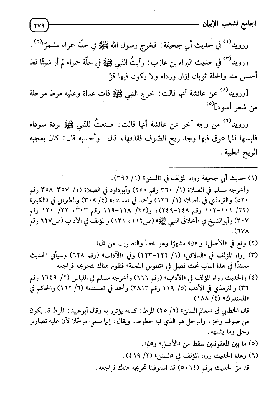 وَرَوَيْنَا مِنْ وَجْهٍ آخَرَ عَنْ عَائِشَةَ أَنَّهَا قَالَتْ: §" صَنَعْتُ لِلنَّبِيِّ صَلَّى اللَّهُ عَلَيْهِ وَسَلَّمَ بُرْدَةً سَوْدَاءَ فَلَبِسَهَا فَلَمَّا عَرَقَ فِيهَا وَجَدَ رِيحَ الصُّوفِ فَقَذَفَهَا قَالَ: وَأَحْسِبُهُ قَالَ: وَكَانَ يُعْجِبُهُ الرِّيحُ الطَّيِّبَةُ "