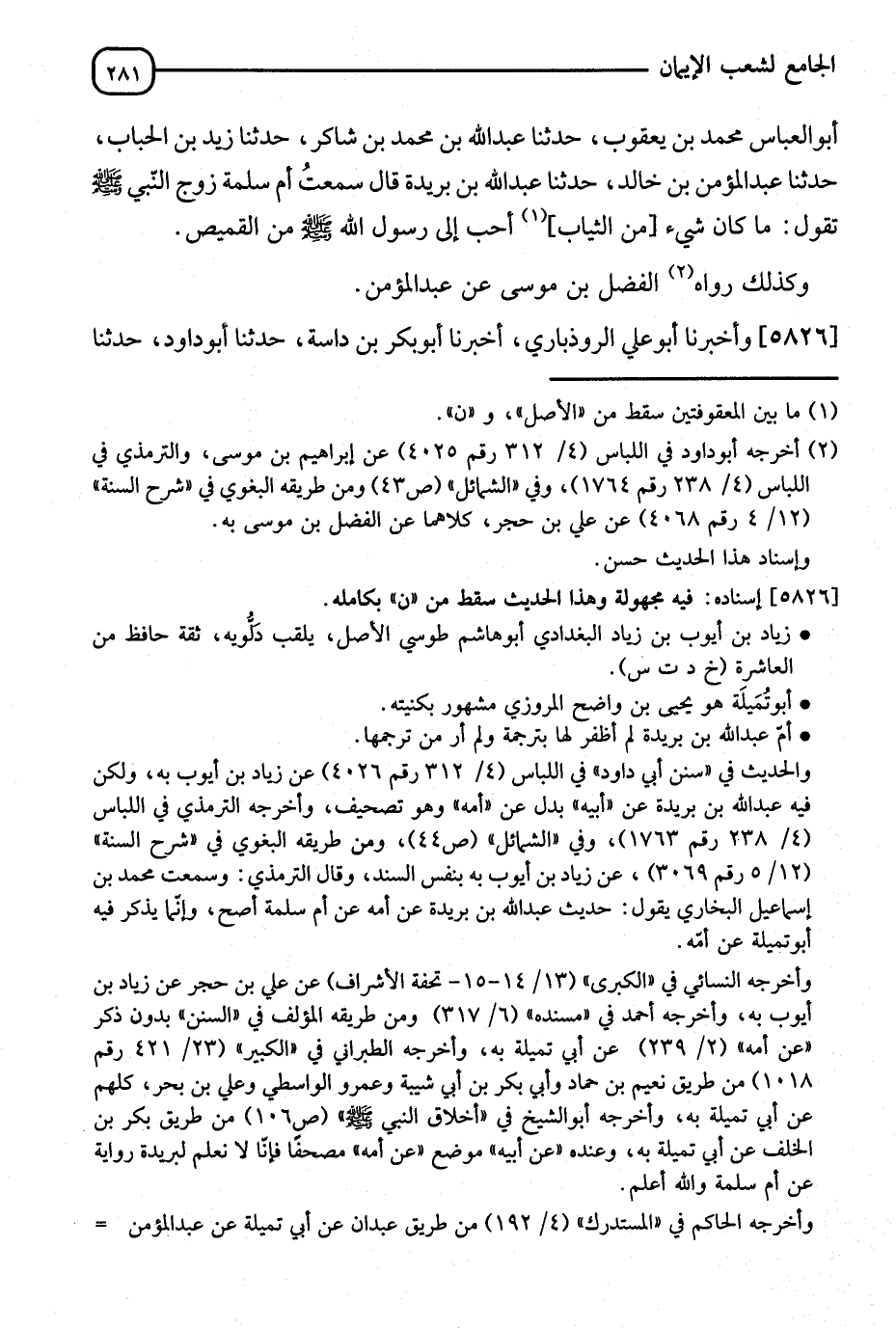 5826 - وَأَخْبَرَنَا أَبُو عَلِيٍّ الرُّوذْبَارِيُّ، أَنَا أَبُو بَكْرِ بْنُ دَاسَةَ، ثَنَا أَبُو دَاوُدَ، ثَنَا -[282]- زِيَادُ بْنُ أَيُّوبَ، ثَنَا أَبُو تُمَيْلَةَ، حَدَّثَنِي عَبْدُ الْمُؤْمِنِ بْنُ خَالِدٍ، عَنْ عَبْدِ اللهِ بْنِ بُرَيْدَةَ، عَنْ أُمِّ سَلَمَةَ قَالَتْ: §" لَمْ يَكُنِ ثَوْبٌ أَحَبَّ إِلَى رَسُولِ اللهِ صَلَّى اللَّهُ عَلَيْهِ وَسَلَّمَ مِنَ الْقَمِيصِ "