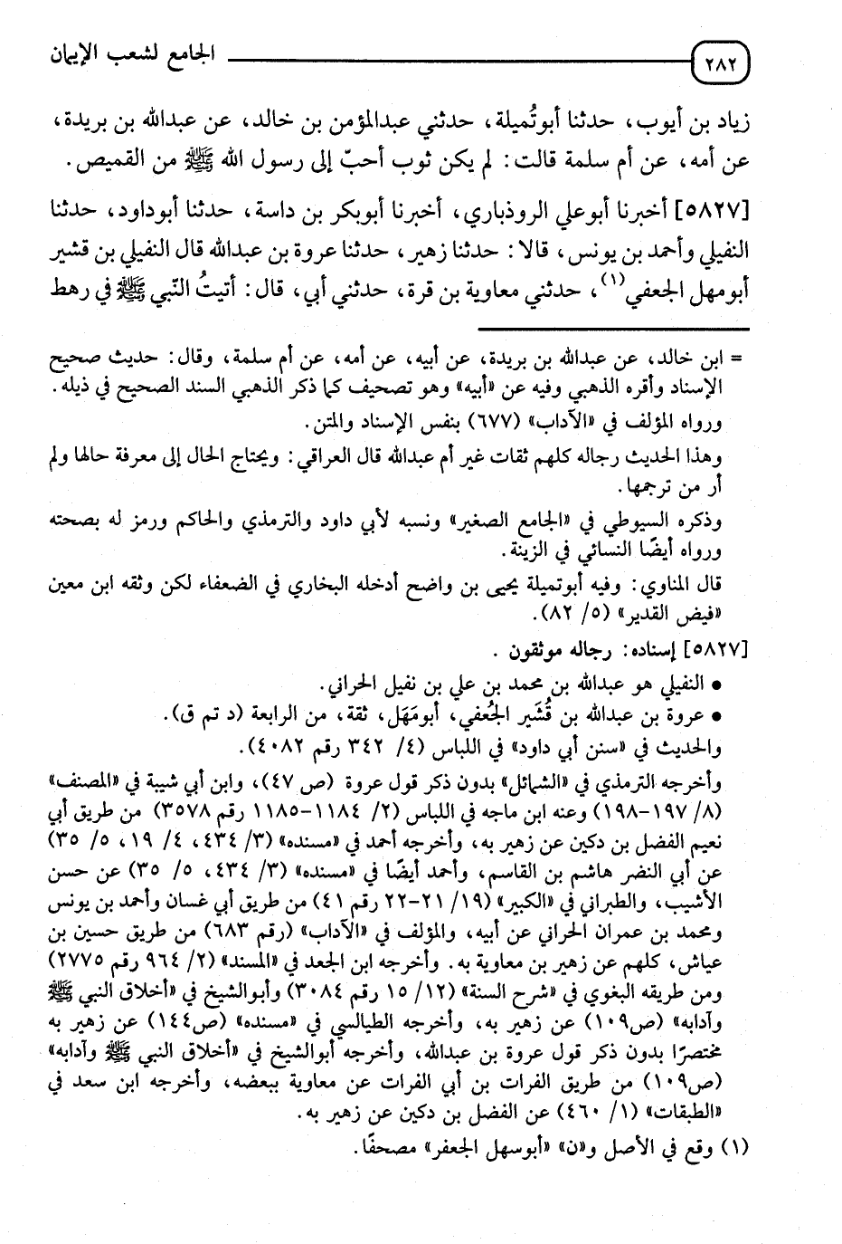 5827 - أَخْبَرَنَا أَبُو عَلِيٍّ الرُّوذْبَارِيُّ، أَنَا أَبُو بَكْرِ بْنُ دَاسَةَ، ثَنَا أَبُو دَاوُدَ، ثَنَا النُّفَيْلِيُّ، وَأَحْمَدُ بْنُ يُونُسَ، ثَنَا زُهَيْرٌ، ثَنَا عُرْوَةُ بْنُ عَبْدِ اللهِ قَالَ: النُّفَيْلِيُّ بْنُ قُشَيْرٍ أَبُو مُهَلٍّ الْجُعْفِيُّ، حَدَّثَنِي مُعَاوِيَةُ بْنُ قُرَّةَ، حَدَّثَنِي أَبِي قَالَ: §أَتَيْتُ رَسُولَ اللهِ صَلَّى اللَّهُ عَلَيْهِ وَسَلَّمَ فِي رَهْطٍ -[283]- مِنْ مُزَيْنَةَ فَبَايَعْنَاهُ وَإِنَّ قَمِيصَهُ لَمُطْلَقُ الْأَزْرَارِ، قَالَ: فَبَايَعْنَاهُ ثُمَّ أَدْخَلْتُ يَدِي فِي جَيْبِ قَمِيصِهِ فَمَسَسْتُ الْخَاتَمَ " قَالَ عَمْرٌو: فَمَا رَأَيْتُ مُعَاوِيَةَ وَلَا ابْنَهُ إِلَّا مُطْلِقي أَزْرَارَهُمَا فِي شِتَاءٍ وَلَا حَرٍّ وَلَا يَزَرَانِ أَزْرَارَهُمَا أَبَدًا