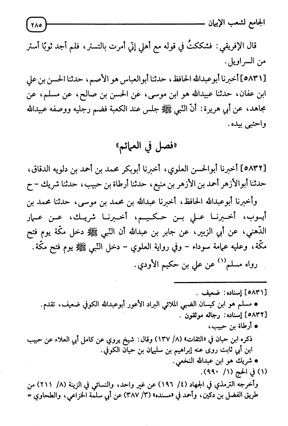 5832 - أَخْبَرَنَا أَبُو الْحَسَنِ الْعَلَوِيُّ، أَنَا أَبُو بَكْرٍ مُحَمَّدُ بْنُ أَحْمَدَ بْنُ دَلُّوَيْهِ الدَّقَّاقُ، ثَنَا أَبُو الْأَزْهَرِ أَحْمَدُ بْنُ الْأَزْهَرِ بْنِ مَنِيعٍ، ثَنَا أَرْطَأَةَ بْنُ حَبِيبٍ، ثَنَا شَرِيكٌ، وَأَخْبَرَنَا أَبُو عَبْدِ اللهِ الْحَافِظُ، أَنَا عَبْدُ اللهِ بْنُ مُحَمَّدِ بْنِ مُوسَى، ثَنَا مُحَمَّدُ بْنُ أَيُّوبَ، أَنَا عَلِيُّ بْنُ حَكِيمٍ، أَنَا شَرِيكٌ، عَنْ عَمَّارٍ الدُّهْنِيِّ، عَنْ أَبِي الزُّبَيْرِ، عَنْ جَابِرِ بْنِ عَبْدِ اللهِ: " أَنَّ النَّبِيَّ صَلَّى اللَّهُ عَلَيْهِ وَسَلَّمَ §دَخَلَ مَكَّةَ يَوْمَ فَتْحِ مَكَّةَ وَعَلَيْهِ عِمَامَةٌ سَوْدَاءُ " وَفِي رِوَايَةِ الْعَلَوِيِّ دَخَلَ النَّبِيُّ صَلَّى اللَّهُ عَلَيْهِ وَسَلَّمَ يَوْمَ فَتْحِ مَكَّةَ. وَرَوَاهُ مُسْلِمٌ عَنْ عَلِيِّ بْنِ حَكِيمٍ الْأَزْدِيِّ