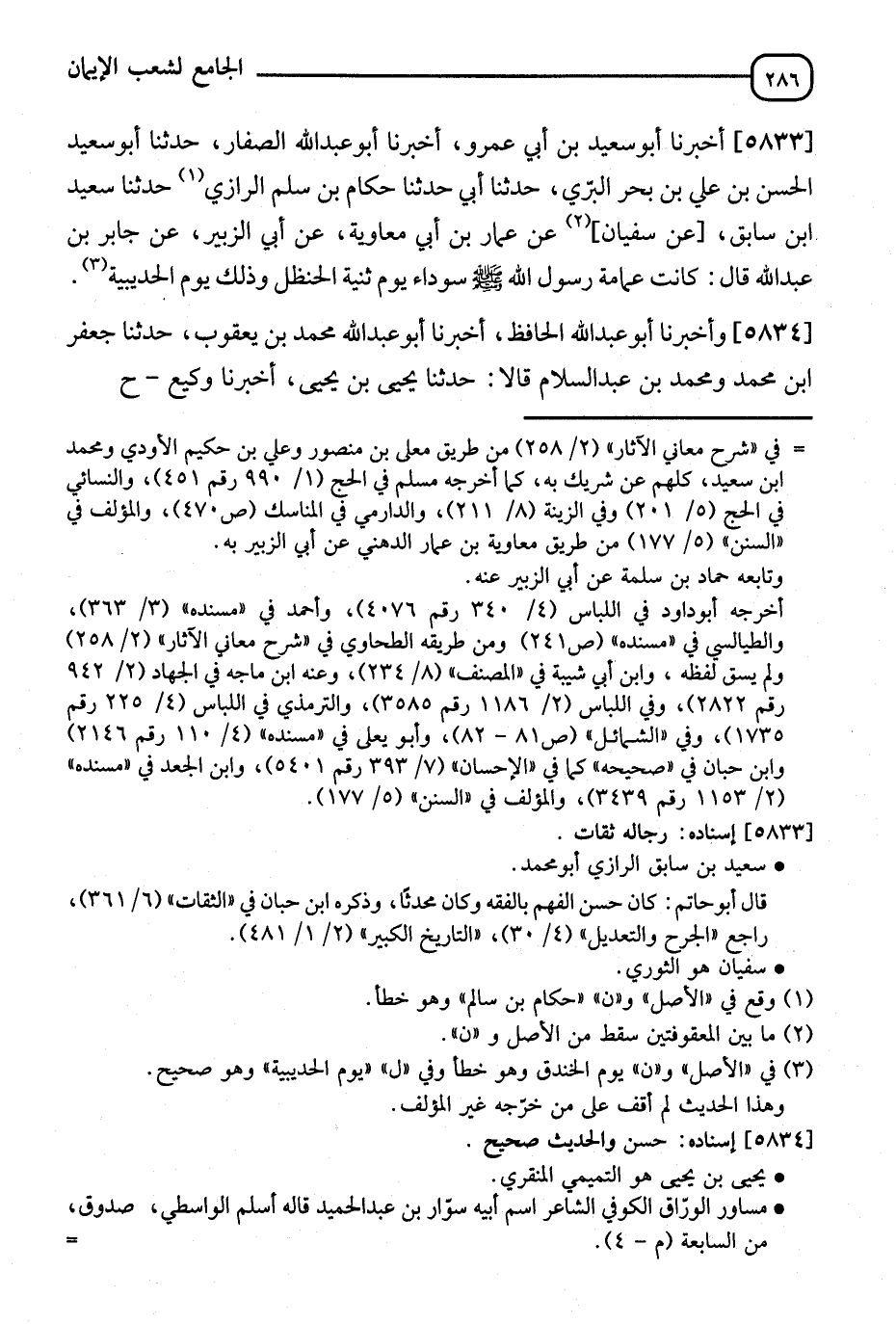 5834 - وَأَخْبَرَنَا أَبُو عَبْدِ اللهِ الْحَافِظُ، أَنَا أَبُو عَبْدِ اللهِ مُحَمَّدُ بْنُ يَعْقُوبَ، ثَنَا جَعْفَرُ بْنُ مُحَمَّدٍ، وَمُحَمَّدُ بْنُ عَبْدِ السَّلَامِ، ثَنَا يَحْيَى بْنُ يَحْيَى، أَنَا وَكِيعٌ -[287]- قَالَ: وَأَخْبَرَنَا أَبُو الْفَضْلِ بْنُ إِبْرَاهِيمَ، ثَنَا أَحْمَدُ بْنُ سَلَمَةَ، ثَنَا إِسْحَاقُ بْنُ إِبْرَاهِيمَ، أَنَا وَكِيعٌ، عَنْ مُسَاوِرٍ الْوَرَّاقِ قَالَ: " وَكَأَنِّي أَنْظُرُ إِلَى رَسُولِ اللهِ صَلَّى اللَّهُ عَلَيْهِ وَسَلَّمَ §وَعَلَيْهِ عِمَامَةٌ سَوْدَاءُ قَدْ أَرْخَى طَرَفَيْهَا بَيْنَ كَتِفَيْهِ "