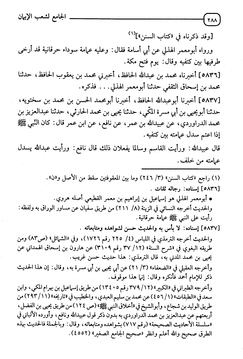 5837 - أَخْبَرَنَا أَبُو عَبْدِ اللهِ الْحَافِظُ، أَنَا أَبُو مُحَمَّدٍ الْحَسَنُ بْنُ مُحَمَّدِ بْنِ سَخْتَوَيْهِ، ثَنَا أَبُو يَحْيَى بْنُ أَبِي مَسَرَّةَ الْمَكِّيُّ، ثَنَا يَحْيَى بْنُ مُحَمَّدٍ الْكَارِيَّ، ثَنَا عَبْدُ الْعَزِيزِ بْنُ مُحَمَّدٍ الدَّرَاوَرْدِيُّ، عَنْ عُبَيْدِ اللهِ بْنِ عُمَرَ، عَنْ نَافِعٍ، عَنِ ابْنِ عُمَرَ قَالَ: كَانَ النَّبِيُّ صَلَّى اللَّهُ عَلَيْهِ وَسَلَّمَ: §" إِذَا اعْتَمَّ سَدَلَ عِمَامَتَهُ بَيْنَ كَتِفَيْهِ " قَالَ عَبْدُ اللهِ: وَرَأَيْتُ الْقَاسِمَ وَسَالِمَ يَفْعَلَانِ ذَلِكَ، قَالَ نَافِعٌ: رَأَيْتُ عَبْدَ اللهِ يَسْدِلُ عِمَامَتَهُ مِنْ خَلْفٍ. -[289]- تَابَعَهُ أَبُو مُصْعَبٍ، عَنِ الدَّرَاوَرْدِيِّ