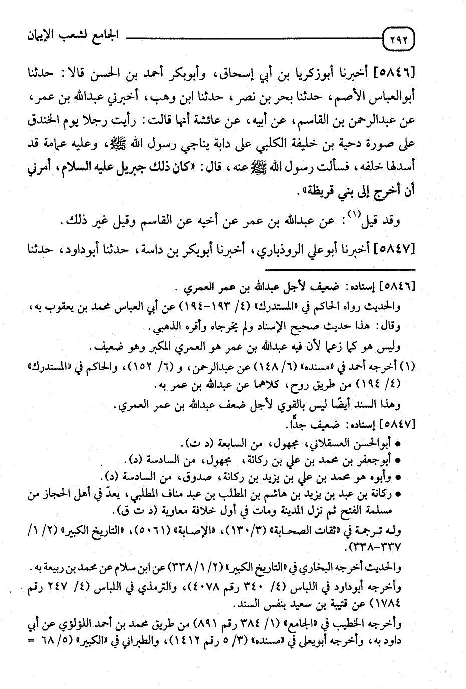 5846 - أَخْبَرَنَا أَبُو زَكَرِيَّا بْنُ أَبِي إِسْحَاقَ، وَأَبُو بَكْرٍ أَحْمَدُ بْنُ الْحَسَنِ، ثَنَا أَبُو الْعَبَّاسِ الْأَصَمُّ، ثَنَا بَحْرُ بْنُ نَصْرٍ، ثَنَا ابْنُ وَهْبٍ، أَخْبَرَنِي عَبْدُ اللهِ بْنُ عُمَرَ، عَنْ عَبْدِ الرَّحْمنِ بْنِ الْقَاسِمِ، عَنْ أَبِيهِ، عَنْ عَائِشَةَ أَنَّهَا قَالَتْ: رَأَيْتُ رَجُلًا يَوْمَ الْخَنْدَقِ عَلَى صُورَةِ دِحْيَةَ بْنِ خَلِيفَةَ الْكَلْبِيِّ عَلَى دَابَّةٍ يُنَاجِي رَسُولَ اللهِ صَلَّى اللَّهُ عَلَيْهِ وَسَلَّمَ وَعَلَيْهِ عِمَامَةٌ قَدْ أَسْدَلَهَا خَلْفَهُ فَسَأَلْتُ رَسُولَ اللهِ صَلَّى اللَّهُ عَلَيْهِ وَسَلَّمَ عَنْهُ قَالَ: " كَانَ ذَلِكَ §جِبْرِيلَ عَلَيْهِ السَّلَامُ أَمَرَنِي أَنْ أَخْرُجَ إِلَى بَنِي قُرَيْظَةَ " وَقَدْ قِيلَ عَنْ عَبْدِ اللهِ بْنِ عُمَرَ، عَنْ أَخِيهِ، عَنِ الْقَاسِمِ وَقِيلَ غَيْرُ ذَلِكَ