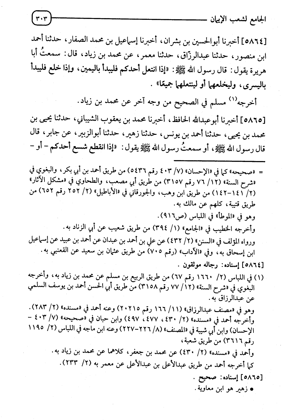 5864 - أَخْبَرَنَا أَبُو الْحُسَيْنِ بْنُ بِشْرَانَ، أَنَا إِسْمَاعِيلُ بْنُ مُحَمَّدٍ الصَّفَّارُ، ثَنَا أَحْمَدُ بْنُ مَنْصُورٍ، ثَنَا عَبْدُ الرَّزَّاقِ، أَنَا مَعْمَرٌ، عَنْ مُحَمَّدِ بْنِ زِيَادٍ قَالَ: سَمِعْتُ أَبَا هُرَيْرَةَ يَقُولُ: قَالَ رَسُولُ اللهِ صَلَّى اللَّهُ عَلَيْهِ وَسَلَّمَ: " إِذَا §انْتَعَلَ أَحَدُكُمْ فَلْيَبْدَأْ بِالْيَمِينِ وَإِذَا خَلَعَ فَلْيَبْدَأْ بِالْيُسْرَى وَلْيَخْلَعْهُمَا أَوْ لِيَنْتَعِلْهُمَا جَمِيعًا " أَخْرَجَهُ مُسْلِمٌ فِي الصَّحِيحِ مِنْ وَجْهٍ آخَرَ عَنْ مُحَمَّدِ بْنِ زِيَادٍ