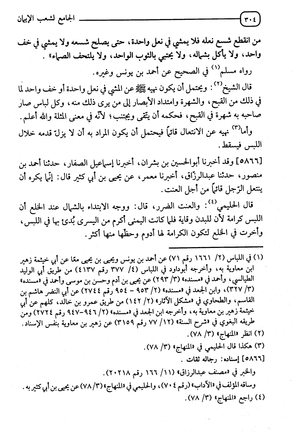5866 - وَقَدْ أَخْبَرَنَا أَبُو الْحُسَيْنِ بْنُ بِشْرَانُ، أَنَا إِسْمَاعِيلُ الصَّفَّارُ، ثَنَا أَحْمَدُ بْنُ مَنْصُورٍ، ثَنَا عَبْدُ الرَّزَّاقِ، أَنَا مَعْمَرٌ، عَنْ يَحْيَى بْنِ أَبِي كَثِيرٍ قَالَ: " إِنَّمَا §نَكْرَهُ أَنْ يَنْتَعِلَ الرَّجُلُ قَائِمًا مِنْ أَجْلِ الْعَنَتِ " قَالَ الْحَلِيمِيُّ: الْعَنَتُ: الضَّرَرُ، قَالَ: وَوَجْهُ الِابْتِدَاءِ بِالشِّمَالِ عِنْدَ الْخَلْعِ أَنَّ اللُّبْسَ كَرَامَةٌ؛ لِأَنَّ لِلْبَدَنِ وِقَايَةً، فَلَمَّا كَانَتِ الْيَمِينُ أَكْرَمَ مِنَ الْيُسْرَى بُدِئَ بِهَا فِي اللُّبْسِ، وَأُخِّرَتْ فِي الْخَلْعِ لِتَكُونَ الْكَرَامَةُ لَهَا أَدْوَمَ وَحَظُّهَا مِنْهَا أَكْثَرَ -[305]- قَالَ: الشَّيْخُ