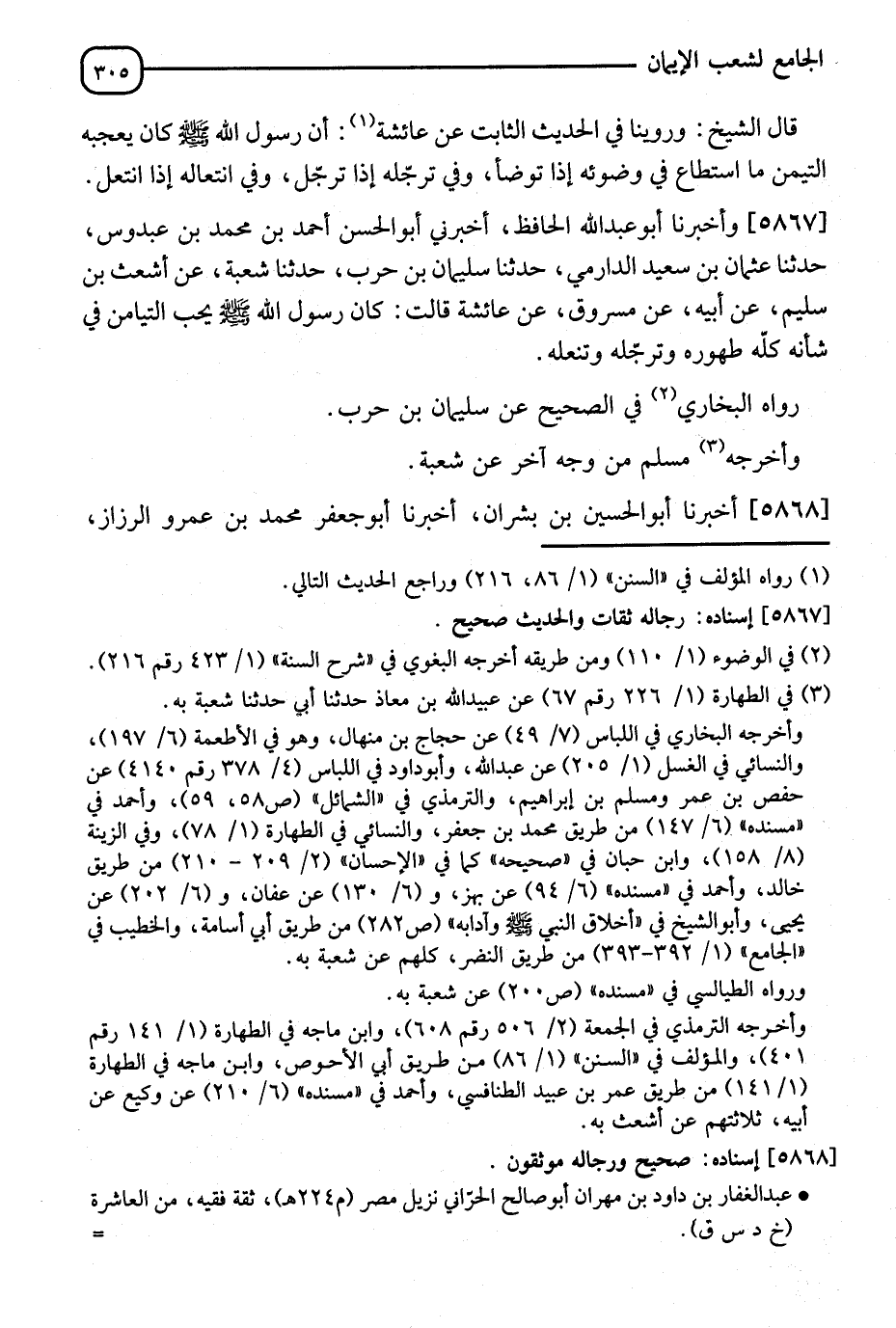 5867 - وَأَخْبَرَنَا أَبُو عَبْدِ اللهِ الْحَافِظُ، أَخْبَرَنِي أَبُو الْحَسَنِ أَحْمَدُ بْنُ مُحَمَّدِ بْنِ عَبْدُوسٍ، ثَنَا عُثْمَانُ بْنُ سَعِيدٍ الدَّارِمِيُّ، ثَنَا سُلَيْمَانُ بْنُ حَرْبٍ، ثَنَا شُعْبَةُ، عَنْ أَشْعَثَ بْنِ سُلَيْمٍ، عَنْ أَبِيهِ، عَنْ مَسْرُوقٍ، عَنْ عَائِشَةَ قَالَتْ: " كَانَ رَسُولُ اللهِ صَلَّى اللَّهُ عَلَيْهِ وَسَلَّمَ §يُحِبُّ التَّيَمُّنَ فِي شَأْنِهِ كُلِّهِ طُهُورِهِ وَتَرَجُّلِهِ وَتَنَعُّلِهِ " رَوَاهُ الْبُخَارِيُّ فِي الصَّحِيحِ عَنْ سُلَيْمَانَ بْنِ حَرْبٍ. وَأَخْرَجَهُ مُسْلِمٌ مِنْ وَجْهٍ آخَرَ عَنْ شُعْبَةَ