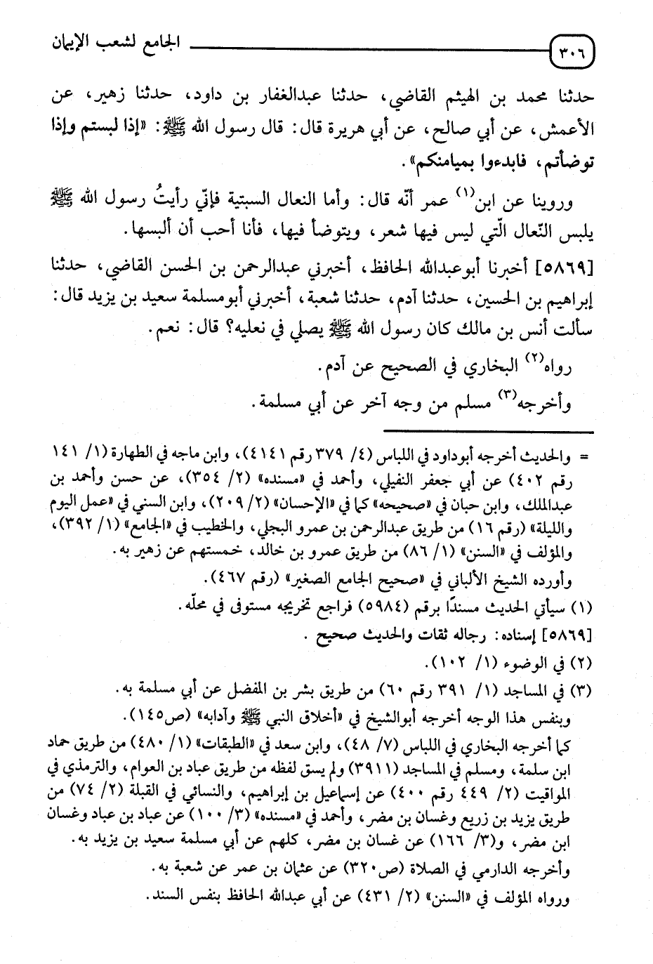 5869 - أَخْبَرَنَا أَبُو عَبْدِ اللهِ الْحَافِظُ، أَخْبَرَنِي عَبْدُ الرَّحْمَنِ بْنُ الْحَسَنِ الْقَاضِي، ثَنَا إِبْرَاهِيمُ بْنُ الْحُسَيْنِ، ثَنَا آدَمُ، ثَنَا شُعْبَةُ، أَخْبَرَنِي أَبُو مَسْلَمَةَ سَعِيدُ بْنُ يَزِيدَ قَالَ: " سَأَلْتُ أَنَسَ بْنَ مَالِكٍ كَانَ رَسُولُ اللهِ صَلَّى اللَّهُ عَلَيْهِ وَسَلَّمَ §يُصَلِّي فِي نَعْلَيْهِ؟ قَالَ: نَعَمْ " رَوَاهُ الْبُخَارِيُّ فِي الصَّحِيحِ عَنْ آدَمَ. وَأَخْرَجَهُ مُسْلِمٌ مِنْ وَجْهٍ آخَرَ عَنْ أَبِي سَلَمَةَ