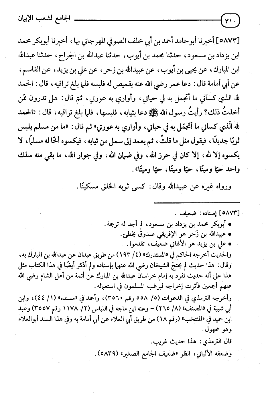 5873 - أَخْبَرَنَا أَبُو حَامِدٍ أَحْمَدُ بْنُ أَبِي خَلَفٍ الصُّوفِيُّ الْمِهْرَجَانِيُّ بِهَا، أَنَا أَبُو بَكْرٍ مُحَمَّدُ بْنُ يَزْدَادَ بْنِ مَسْعُودٍ، ثَنَا مُحَمَّدُ بْنُ أَيُّوبَ، ثَنَا عَبْدُ اللهِ بْنُ الْجَرَّاحِ، ثَنَا عَبْدُ اللهِ بْنِ الْمُبَارَكِ، عَنْ يَحْيَى بْنِ أَيُّوبَ، عَنْ عُبَيْدِ اللهِ بْنِ زَحْرٍ، عَنْ عَلِيِّ بْنِ يَزِيدَ، عَنِ الْقَاسِمِ، عَنْ أَبِي أُمَامَةَ قَالَ: دَعَا عُمَرُ رَضِيَ اللهُ عَنْهُ بِقَمِيصٍ لَهُ فَلَبِسَهُ فَلَمَّا بَلَغَ تَرَاقِيهِ قَالَ: §" الْحَمْدُ لِلَّهِ الَّذِي كَسَانِي مَا أَتَجَمَّلُ بِهِ فِي حَيَاتِي وَأُوَارِي بِهِ عَوْرَتِي ثُمَّ قَالَ: هَلْ تَدْرُونَ مِمَّنْ أُحَدِّثُ ذَاكَ رَأَيْتُ رَسُولَ اللهِ صَلَّى اللَّهُ عَلَيْهِ وَسَلَّمَ دَعَا بِثِيَابِهِ فَلَبِسَهَا فَلَمَّا بَلَغَ تَرَاقِيهِ قَالَ: الْحَمْدُ لِلَّهِ الَّذِي كَسَانِي مَا أَتَجَمَّلُ بِهِ فِي حَيَاتِي، وَأُوَارِي بِهِ عَوْرَتِي ثُمَّ قَالَ: مَا مِنْ مُسْلِمٍ يَلْبَسُ ثَوْبًا جَدِيدًا فَيَقُولُ مِثْلَ مَا قُلْتُ ثُمَّ يَعْمِدُ إِلَى شَيْءٍ مِنْ ثِيَابِهِ فَيَكْسُوهُ أَخًا لَهُ مُسْلِمًا لَا يَكْسُوهُ إِلَّا لِلَّهِ إِلَّا كَانَ فِي حِرْزِ اللهِ وَفِي ضَمَانِ اللهِ وَفِي جِوَارِ اللهِ مَا بَقِيَ مِنْهُ سَلَكَ وَاحِدٌ حَيًّا وَمَيِّتًا حَيًّا وَمَيِّتًا حَيًّا وَمَيِّتًا " " وَرَوَاهُ غَيْرُهُ عَنْ عُبَيْدِ اللهِ وَقَالَ كَسَا ثَوْبَهُ الْخَلِقَ مِسْكِينًا "