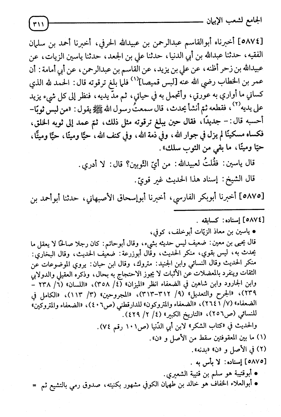 5874 - أَخْبَرَنَاهُ أَبُو الْقَاسِمِ عَبْدُ الرَّحْمَنِ بْنِ عُبَيْدِ اللهِ الْخُرْقِي، أَنَا أَحْمَدُ بْنُ سَلْمَانَ الْفَقِيهُ، ثَنَا عَبْدُ اللهِ بْنُ أَبِي الدُّنْيَا، ثَنَا عَلِيُّ بْنُ الْجَعْدِ، ثَنَا يَاسِينُ الزَّيَّاتُ، عَنْ عُبَيْدِ اللهِ بْنِ زَحْرٍ، أَظُنُّهُ عَنْ عَلِيِّ بْنِ يَزِيدَ، عَنِ الْقَاسِمِ بْنِ عَبْدِ الرَّحْمَنِ، عَنْ أَبِي أُمَامَةَ: أَنَّ عُمَرَ بْنَ الْخَطَّابِ رَضِيَ اللهُ عَنْهُ: دَعَا بِقَمِيصٍ لَهُ فَلَبِسَهُ فَلَمَّا بَلَغَ تَرْقُوَتَهُ قَالَ: الْحَمْدُ لِلَّهِ الَّذِي كَسَانِي مَا أُوَارِي بِهِ عَوْرَتِي، وَأَتَجَمَّلُ بِهِ فِي حَيَاتِي، ثُمَّ مَدَّ يَدَيْهِ فَنَظَرَ إِلَى كُلِّ شَيْءٍ يَزِيدُ عَلَى بَدَنِهِ، فَقَطَعَهُ ثُمَّ أَنْشَأَ يُحَدِّثُ قَالَ سَمِعْتُ رَسُولَ اللهِ صَلَّى اللَّهُ عَلَيْهِ وَسَلَّمَ يَقُولُ: " §مَنْ لَبِسَ ثَوْبًا - أَحْسِبُهُ قَالَ - جَدِيدًا فَقَالَ: حِينَ يَبْلُغُ تَرْقُوَتَهُ مِثْلَ ذَلِكَ ثُمَّ عَمَدَ إِلَى ثَوْبِهِ الْخَلِقِ فَكَسَاهُ مِسْكِينًا لَمْ يَزَلْ فِي جِوَارِ اللهِ وَفِي ذِمَّةِ اللهِ وَفِي كَنَفِ اللهِ حَيًّا وَمَيِّتًا حَيًّا وَمَيِّتًا حَيًّا وَمَيِّتًا مَا بَقِيَ مِنَ الثَّوْبِ سَلَكَ " قَالَ يَاسِينُ، قُلْتُ لِعُبَيْدِ اللهِ: مِنْ أَيِّ الثَّوْبَيْنِ؟ قَالَ: لَا أَدْرِي. قَالَ الشَّيْخُ: " إِسْنَادُ هَذَا الْحَدِيثِ غَيْرُ قَوِيٍّ "