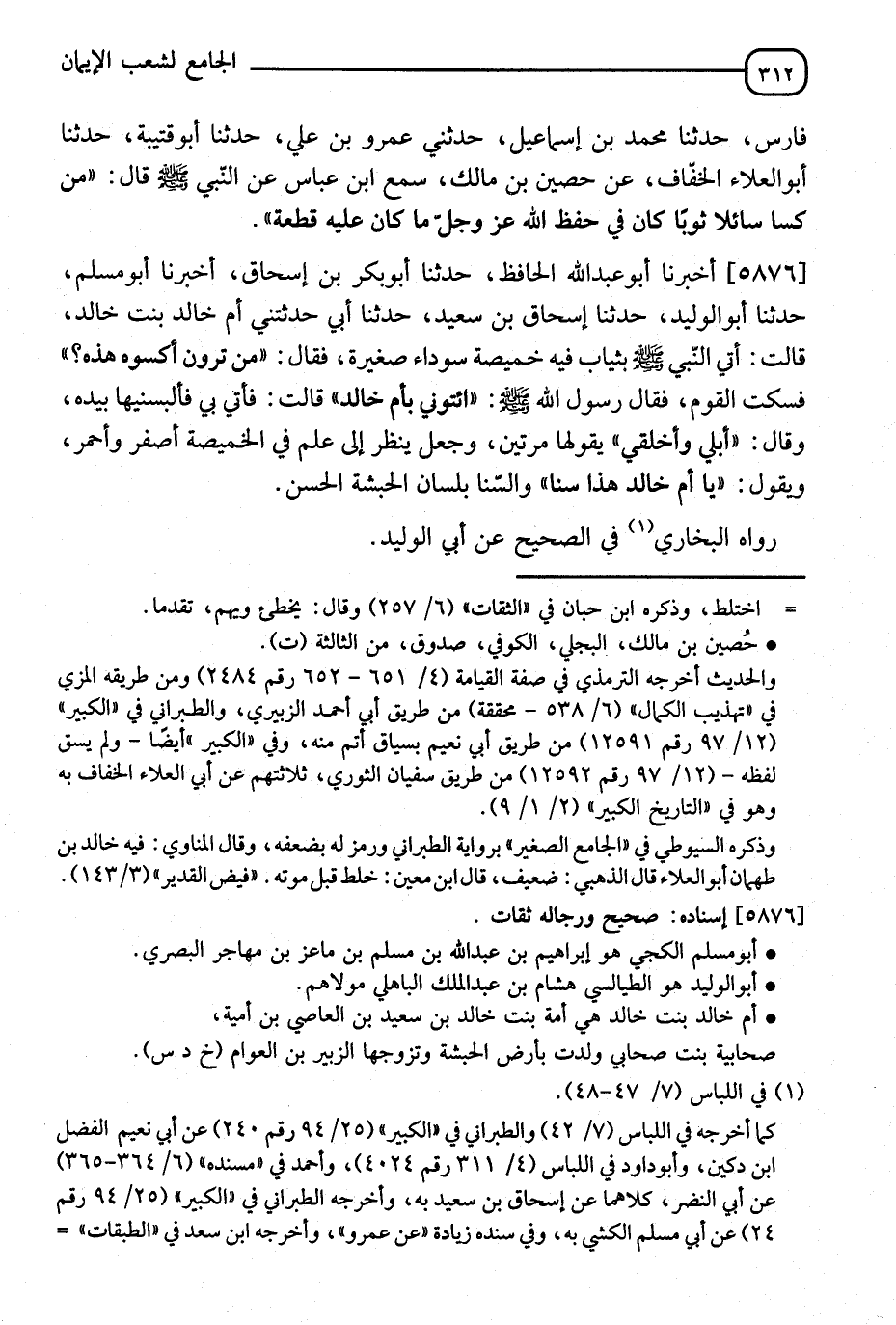 5876 - أَخْبَرَنَا أَبُو عَبْدِ اللهِ الْحَافِظُ، ثَنَا أَبُو بَكْرِ بْنُ إِسْحَاقَ، أَنَا أَبُو مُسْلِمٍ، ثَنَا أَبُو الْوَلِيدِ، ثَنَا إِسْحَاقُ بْنُ سَعِيدٍ، ثَنَا أَبِي، حَدَّثَتْنِي أُمُّ خَالِدٍ بِنْتُ خَالِدٍ قَالَتْ: أُتِيَ النَّبِيُّ صَلَّى اللَّهُ عَلَيْهِ وَسَلَّمَ بِثِيَابٍ فِيهِ خَمِيصَةٌ سَوْدَاءُ صَغِيرَةٌ، فَقَالَ: §" مَنْ تَرَوْنَ أَكْسُوهَذِهِ؟ " فَسَكَتِ الْقَوْمَ فَقَالَ رَسُولُ اللهِ صَلَّى اللَّهُ عَلَيْهِ وَسَلَّمَ: " ائْتُونِي بِأُمِّ خَالِدٍ " قَالَتْ: فَأُتِيَ بِي فَأَلْبَسَنِيهَا بِيَدِهِ وَقَالَ: " أَبْلِي وَأَخْلِقِي " يَقُولَهُمَا مَرَّتَيْنِ وَجَعَلَ يَنْظُرُ إِلَى عَلَمٍ فِي الْخَمِيصَةِ أَصْفَرَ وَأَحْمَرَ وَيَقُولُ: " يَا أُمَّ خَالِدٍ هَذَا سِنًّا وَالسَّنَا بِلِسَانِ الْحَبَشَةِ الْحَسَنُ " رَوَاهُ الْبُخَارِيُّ فِي الصَّحِيحِ عَنْ أَبِي الْوَلِيدِ