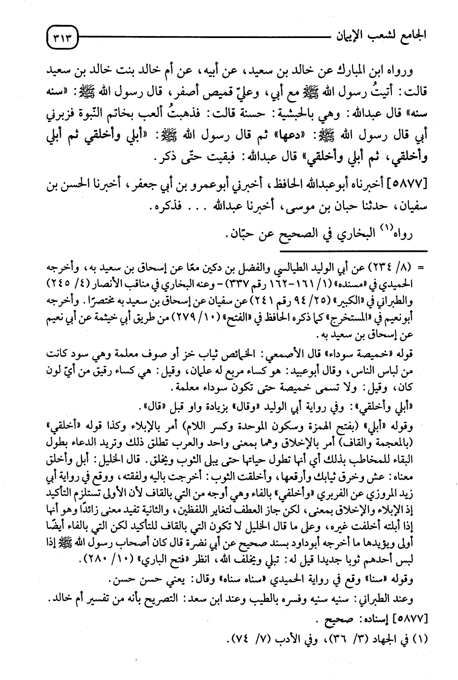 وَرَوَاهُ ابْنُ الْمُبَارَكِ، عَنْ خَالِدِ بْنِ سَعِيدٍ، عَنْ أَبِيهِ، عَنْ أُمِّ خَالِدٍ بِنْتِ خَالِدِ بْنِ سَعِيدٍ قَالَتْ: أَتَيْتُ رَسُولَ اللهِ صَلَّى اللَّهُ عَلَيْهِ وَسَلَّمَ مَعَ أَبِي وَعَلَيَّ قَمِيصٌ أَصْفَرُ، قَالَ رَسُولُ اللهِ صَلَّى اللَّهُ عَلَيْهِ وَسَلَّمَ: " سَنَهْ سَنَهْ " قَالَ عَبْدُ اللهِ وَهِيَ بِالْحَبَشَةِ: حَسَنَةٌ، قَالَتْ: فَذَهَبْتُ أَلْعَبُ بِخَاتَمِ النُّبُوَّةِ فَزَبَرَنِي أَبِي، قَالَ رَسُولُ اللهِ صَلَّى اللَّهُ عَلَيْهِ وَسَلَّمَ: " دَعْهَا " ثُمَّ قَالَ رَسُولُ اللهِ: " §أَبْلِي وَأَخْلِقِي، ثُمَّ أَبْلِي وَأَخْلِقِي، ثُمَّ أَبْلِي وَأَخْلِقِي " قَالَ عَبْدُ اللهِ فَبَقِيَتْ حَتَّى ذَكَرَ
