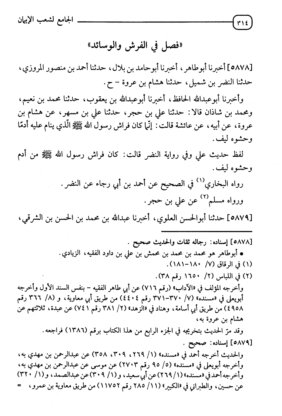 5878 - أَخْبَرَنَا أَبُو طَاهِرٍ الْفَقِيهُ، أَنَا أَبُو حَامِدِ بْنُ بِلَالٍ، ثَنَا أَحْمَدُ بْنُ مَنْصُورٍ الْمَرْوَزِيُّ، ثَنَا النَّضْرُ بْنُ شُمَيْلٍ، أَنَا هِشَامُ بْنُ عُرْوَةَ، ح، أَخْبَرَنَا أَبُو عَبْدِ اللهِ الْحَافِظُ، أَنَا أَبُو عَبْدِ اللهِ بْنُ يَعْقُوبَ، ثَنَا مُحَمَّدُ بْنُ نُعَيْمٍ، وَمُحَمَّدُ بْنُ شَاذَانَ، ثَنَا عَلِيُّ بْنُ حُجْرٍ، ثَنَا عَلِيُّ بْنُ مُسْهِرٍ، عَنْ هِشَامِ بْنِ عُرْوَةَ، عَنْ أَبِيهِ، عَنْ عَائِشَةَ قَالَتْ: " إِنَّمَا كَانَ §فِرَاشُ رَسُولِ اللهِ صَلَّى اللَّهُ عَلَيْهِ وَسَلَّمَ الَّذِي يَنَامُ عَلَيْهِ أَدَمًا حَشْوُهُ لِيفٌ " لَفْظُ حَدِيثِ عَلِيٍّ وَفِي رِوَايَةِ النَّضْرِ قَالَتْ كَانَ فِرَاشُ رَسُولِ اللهِ صَلَّى اللَّهُ عَلَيْهِ وَسَلَّمَ مِنْ أَدَمٍ حَشْوُهُ لِيفٌ. رَوَاهُ الْبُخَارِيُّ فِي الصَّحِيحِ عَنْ أَحْمَدَ بْنِ أَبِي رَجَاءٍ عَنِ النَّضْرِ. وَرَوَاهُ مُسْلِمٌ عَنْ عَلِيِّ بْنِ حُجْرٍ