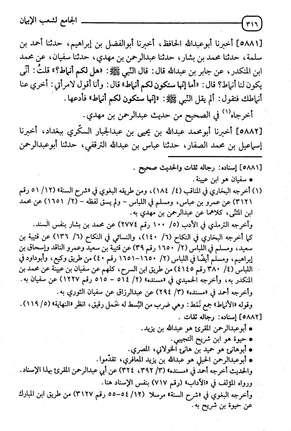 5881 - أَخْبَرَنَا أَبُو عَبْدِ اللهِ الْحَافِظُ، أَنَا أَبُو الْفَضْلِ بْنُ إِبْرَاهِيمَ، ثَنَا أَحْمَدُ بْنُ سَلَمَةَ، ثَنَا مُحَمَّدُ بْنُ بَشَّارٍ، ثَنَا عَبْدُ الرَّحْمَنِ بْنُ مَهْدِيٍّ، ثَنَا سُفْيَانُ، عَنْ مُحَمَّدِ بْنِ الْمُنْكَدِرِ، عَنْ جَابِرِ بْنِ عَبْدِ اللهِ قَالَ: قَالَ النَّبِيُّ صَلَّى اللَّهُ عَلَيْهِ وَسَلَّمَ: " هَلْ لَكُمْ أَنْمَاطُ؟ " قُلْتُ: أَنَّى يَكُونُ لَنَا أَنْمَاطُ قَالَ: " §أَمَا إِنَّهَا سَتَكُونُ لَكُمْ أَنْمَاطُ " قَالَ: وَأَنَا أَقُولُ لِامْرَأَتِي: أَخِّرِي عَنَّا أَنْمَاطَكِ فَتَقُولُ أَلَمْ يَقُلِ النَّبِيُّ صَلَّى اللَّهُ عَلَيْهِ وَسَلَّمَ " إِنَّهَا سَتَكُونُ لَكُمْ أَنْمَاطُ فَأَدَعُهَا " أَخْرَجَاهُ مِنْ حَدِيثِ عَبْدِ الرَّحْمَنِ بْنِ مَهْدِيٍّ