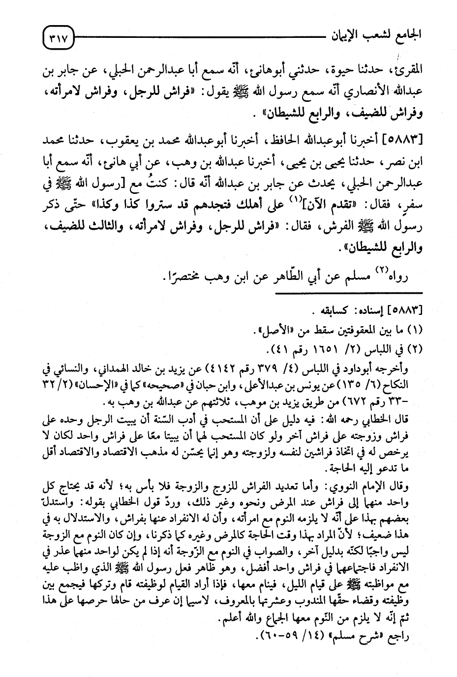 5883 - أَخْبَرَنَا أَبُو عَبْدِ اللهِ الْحَافِظُ، أَنَا أَبُو عَبْدِ اللهِ مُحَمَّدُ بْنُ يَعْقُوبَ، ثَنَا مُحَمَّدُ بْنُ نَصْرٍ، ثَنَا يَحْيَى بْنُ يَحْيَى، أَنَا عَبْدُ اللهِ بْنُ وَهْبٍ، عَنْ أَبِي هَانِئٍ، أَنَّهُ سَمِعَ أَبَا عَبْدِ الرَّحْمَنِ الْحُبُلِيَّ، يُحَدِّثُ عَنْ جَابِرِ بْنِ عَبْدِ اللهِ أَنَّهُ قَالَ كُنْتُ مَعَ رَسُولِ اللهِ صَلَّى اللَّهُ عَلَيْهِ وَسَلَّمَ فِي سَفَرٍ فَقَالَ: " تَقَدَّمِ الْآنَ عَلَى أَهْلِكَ فَتَجِدَهُمْ قَدْ سُتِرُوا كَذَا وَكَذَا " حَتَّى ذَكَرَ رَسُولُ اللهِ صَلَّى اللَّهُ عَلَيْهِ وَسَلَّمَ الْفُرُشَ فَقَالَ: §" فِرَاشٌ لِلرَّجُلِ وَفِرَاشٌ لِامْرَأَتِهِ وَالثَّالِثُ لِلضَّيْفِ وَالرَّابِعُ لِلشَّيْطَانِ " رَوَاهُ مُسْلِمٌ عَنْ أَبِي الطَّاهِرِ، عَنِ ابْنِ وَهْبٍ مُخْتَصَرًا
