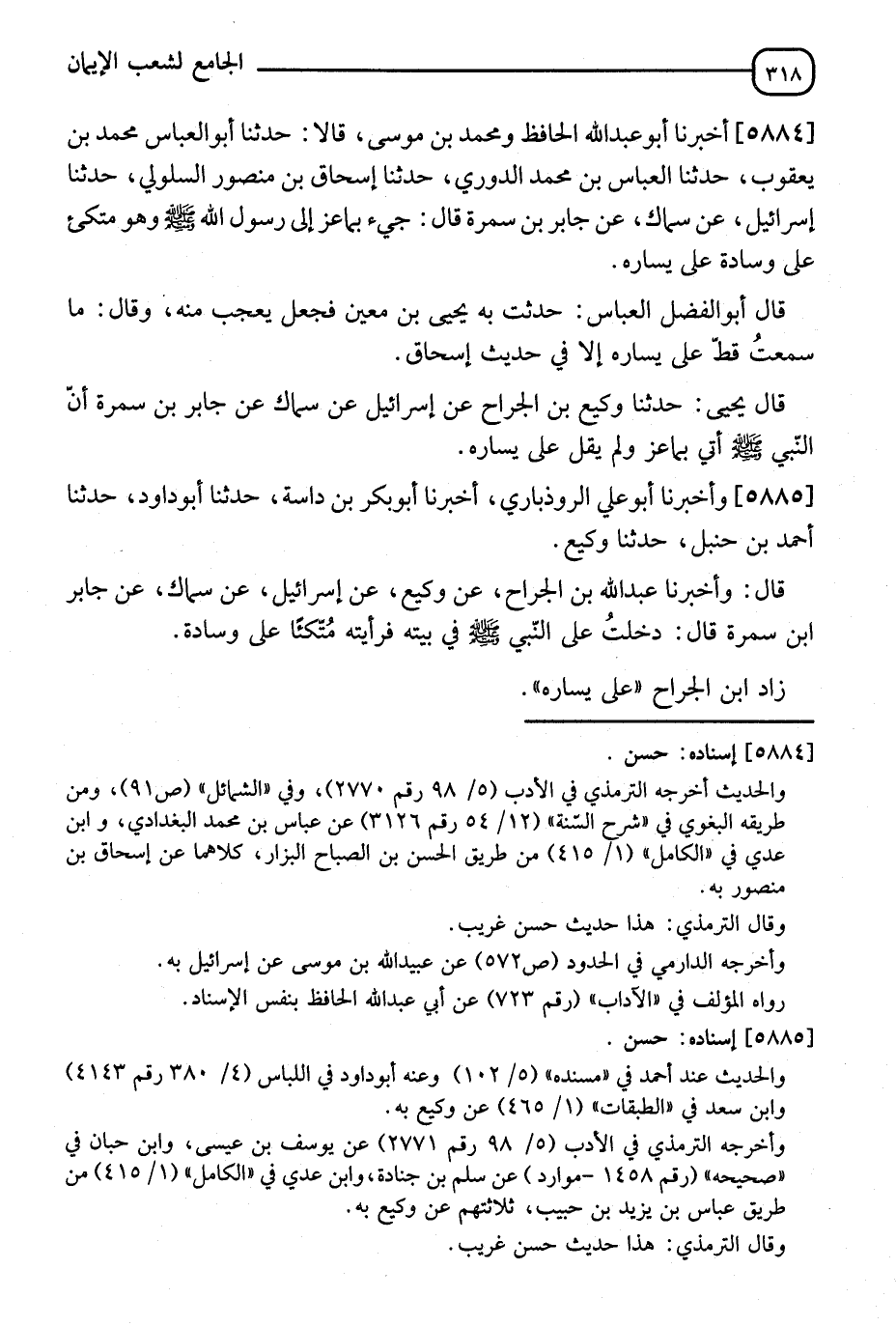 5884 - أَخْبَرَنَا أَبُو عَبْدِ اللهِ الْحَافِظُ، وَمُحَمَّدُ بْنُ مُوسَى، ثَنَا أَبُو الْعَبَّاسِ مُحَمَّدُ بْنُ يَعْقُوبَ، ثَنَا الْعَبَّاسُ بْنُ مُحَمَّدٍ الدُّورِيُّ، ثَنَا إِسْحَاقُ بْنُ مَنْصُورٍ السَّلُولِيُّ، ثَنَا إِسْرَائِيلُ، عَنْ سِمَاكٍ، عَنْ جَابِرِ بْنِ سَمُرَةَ قَالَ: §" جِيءَ بِمَاعِزٍ إِلَى رَسُولِ اللهِ صَلَّى اللَّهُ عَلَيْهِ وَسَلَّمَ وَهُوَ مُتَّكِئٌ عَلَى وِسَادَةٍ عَلَى يَسَارِهِ " قَالَ أَبُو الْفَضْلِ الْعَبَّاسُ