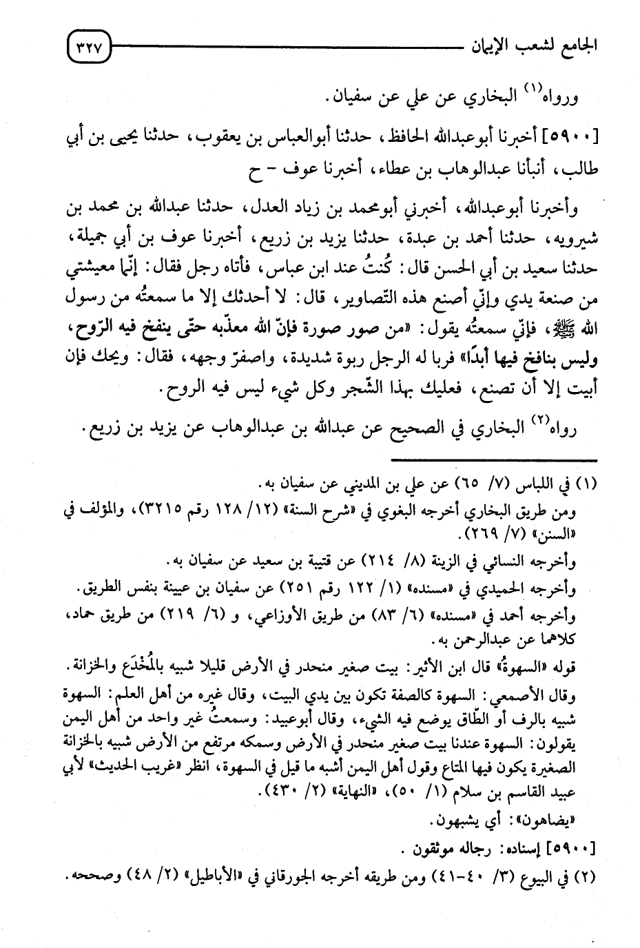 5900 - أَخْبَرَنَا أَبُو عَبْدِ اللهِ الْحَافِظُ، ثَنَا أَبُو الْعَبَّاسِ بْنُ يَعْقُوبَ، ثَنَا يَحْيَى بْنُ أَبِي طَالِبٍ، أَنَا عَبْدُ الْوَهَّابِ بْنُ عَطَاءٍ، أَنَا عَوْفٌ، ح، وَأَخْبَرَنَا أَبُو عَبْدِ اللهِ، أَخْبَرَنِي أَبُو مُحَمَّدِ بْنُ زِيَادٍ الْعَدْلُ، ثَنَا عَبْدُ اللهِ بْنُ مُحَمَّدِ بْنِ شِيرَوَيْهِ، ثَنَا أَحْمَدُ بْنُ عَبْدَةَ، ثَنَا يَزِيدُ بْنُ زُرَيْعٍ، أَنَا عَوْفُ بْنُ أَبِي جَمِيلَةَ، ثَنَا سَعِيدُ بْنُ أَبِي الْحَسَنِ قَالَ: كُنْتُ عِنْدَ ابْنِ عَبَّاسٍ فَأَتَاهُ رَجُلٌ فَقَالَ: إِنَّمَا مَعِيشَتِي مِنْ صَنْعَةِ يَدِي وَإِنِّي أَصْنَعُ هَذِهِ التَّصَاوِيرَ قَالَ: لَا أُحَدِّثُكَ إِلَّا مَا سَمِعْتُهُ مِنْ رَسُولِ اللهِ صَلَّى اللَّهُ عَلَيْهِ وَسَلَّمَ فَإِنِّي سَمِعْتُهُ يَقُولُ: §" مَنْ صَوَّرَ صُورَةً فَإِنَّ اللهَ يُعَذِّبُهُ حَتَّى يَنْفُخَ فِيهَا الرُّوحَ وَلَيْسَ بِنَافِخٍ فِيهَا أَبَدًا " فَرَبَا لَهُ الرَّجُلُ رَبْوَةً شَدِيدَةً وَاصْفَرَّ وَجْهُهُ فَقَالَ: " وَيْحَكَ فَإِنْ أَبَيْتَ أَلَّا تَصْنَعَ فَعَلَيْكَ بِهَذَا الشَّجَرِ وَكُلِّ شَيْءٍ لَيْسَ فِيهِ الرُّوحُ " رَوَاهُ الْبُخَارِيُّ عَنْ عَبْدِ اللهِ بْنِ عَبْدِ الْوَهَّابِ عَنْ يَزِيدَ بْنِ زُرَيْعٍ، -[328]- وَأَخْرَجَهُ مُسْلِمٌ مِنْ وَجْهٍ آخَرَ عَنْ سَعِيدٍ