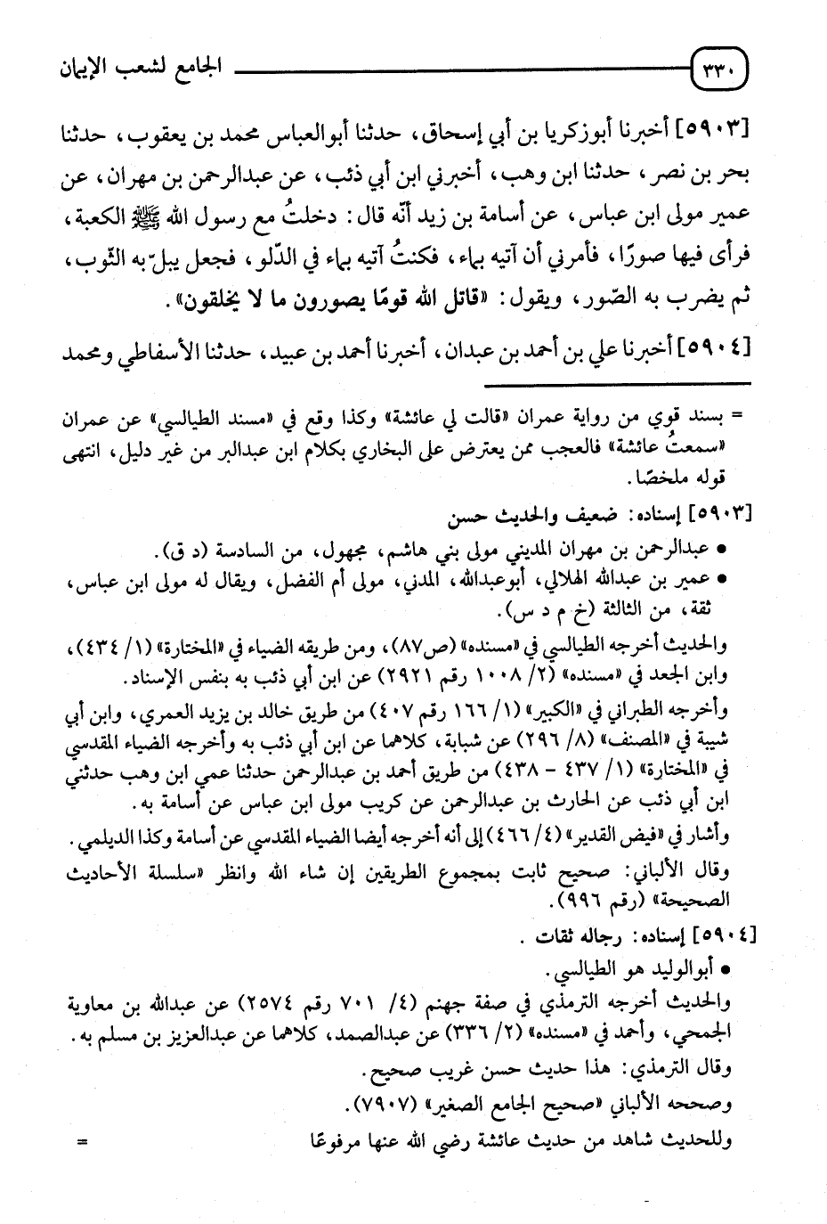 5903 - أَخْبَرَنَا أَبُو زَكَرِيَّا بْنُ أَبِي إِسْحَاقَ، ثَنَا أَبُو الْعَبَّاسِ مُحَمَّدُ بْنُ يَعْقُوبَ، ثَنَا بَحْرُ بْنُ نَصْرٍ، ثَنَا ابْنُ وَهْبٍ، أَخْبَرَنِي ابْنُ أَبِي ذِئْبٍ، عَنْ عَبْدِ الرَّحْمَنِ بْنِ مِهْرَانَ، عَنْ عُمَيْرٍ، مَوْلَى ابْنِ عَبَّاسٍ، عَنْ أُسَامَةَ بْنِ زَيْدٍ، أَنَّهُ قَالَ: دَخَلْتُ مَعَ رَسُولِ اللهِ صَلَّى اللَّهُ عَلَيْهِ وَسَلَّمَ الْكَعْبَةَ فَرَأَى فِيهَا صُوَرًا، فَأَمَرَنِي أَنْ آتِيَهُ بِمَاءٍ، فَكُنْتُ آتِيهِ بِمَاءٍ فِي الدَّلْوِ، فَجَعَلَ يَبُلُّ الثَّوْبَ ثُمَّ يَضْرِبُ بِهِ الصُّوَرَ وَيَقُولُ: §" قَاتَلَ اللهُ قَوْمًا يُصَوِّرُونَ مَا لَا يَخْلُقُونَ "