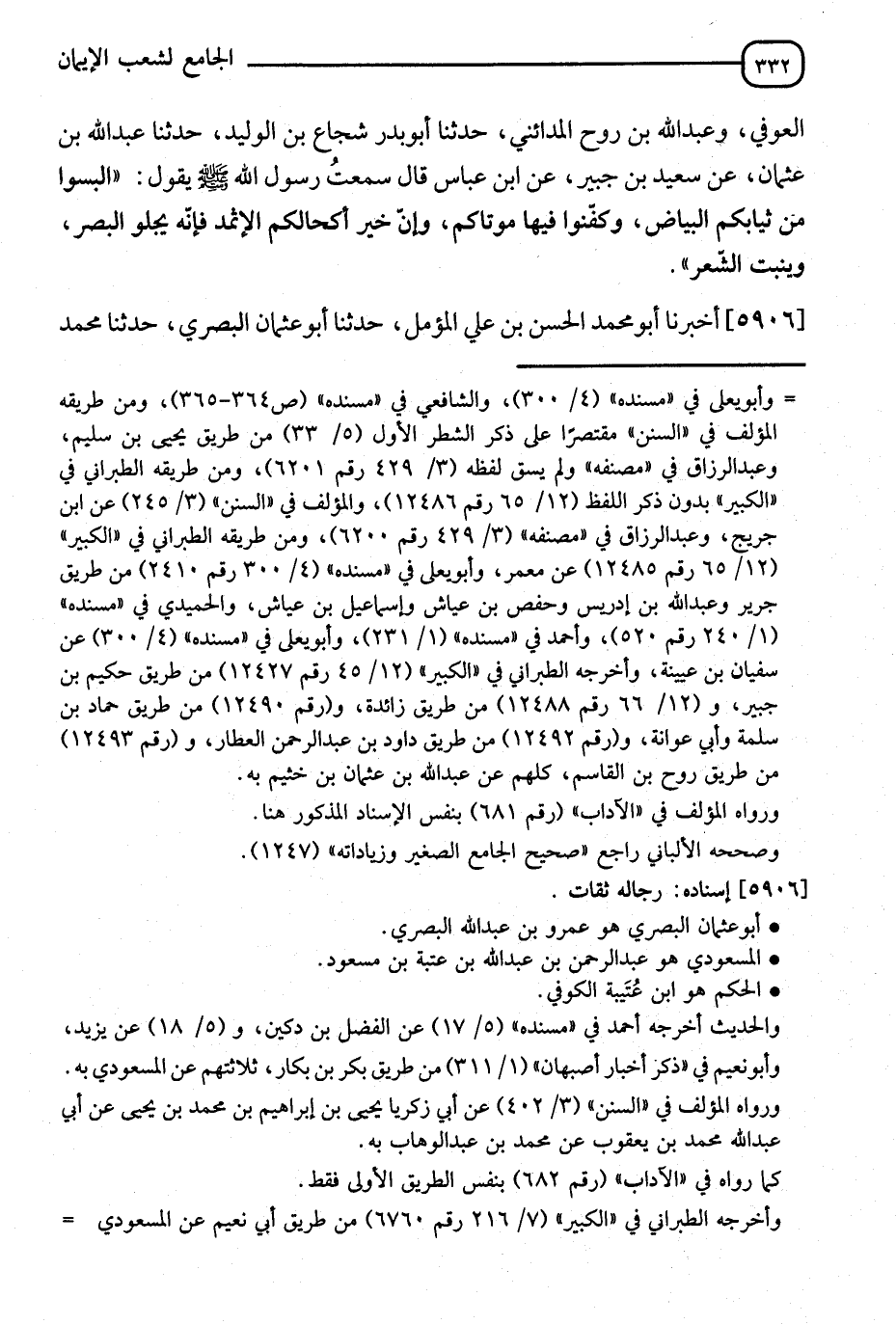 5906 - أَخْبَرَنَا أَبُو مُحَمَّدٍ الْحَسَنُ بْنُ عَلِيٍّ الْمُؤَمَّلُ، ثَنَا أَبُو عُثْمَانَ الْبَصْرِيُّ، ثَنَا مُحَمَّدُ -[333]- بْنُ عَبْدِ الْوَهَّابِ، أَنَا جَعْفَرُ بْنُ عَوْنٍ، ثَنَا الْمَسْعُودِيُّ، عَنْ حَبِيبِ بْنِ أَبِي ثَابِتٍ، وَالْحَكَمُ، عَنْ مَيْمُونِ بْنِ أَبِي شَبِيبٍ، ح، وَأَخْبَرَنَا أَبُو طَاهِرٍ الْفَقِيهُ، أَنَا أَبُو بَكْرٍ مُحَمَّدُ بْنُ الْحُسَيْنِ الْقَطَّانُ، ثَنَا أَحْمَدُ بْنُ يُوسُفَ السَّلَمِيُّ، ثَنَا يَحْيَى بْنُ أَبِي بُكَيْرٍ، ثَنَا حَمْزَةُ الزَّيَّاتُ، عَنْ حَبِيبِ بْنِ أَبِي ثَابِتٍ، عَنْ مَيْمُونِ بْنِ أَبِي شَبِيبٍ، عَنْ سَمُرَةَ بْنِ جُنْدُبٍ قَالَ: قَالَ رَسُولُ اللهِ صَلَّى اللَّهُ عَلَيْهِ وَسَلَّمَ: §" الْبَسُوا هَذِهِ الثِّيَابَ الْبِيضَ فَإِنَّهَا أَطْيَبُ وَأَطْهَرُ وَكَفِّنُوا فِيهَا مَوْتَاكُمْ "