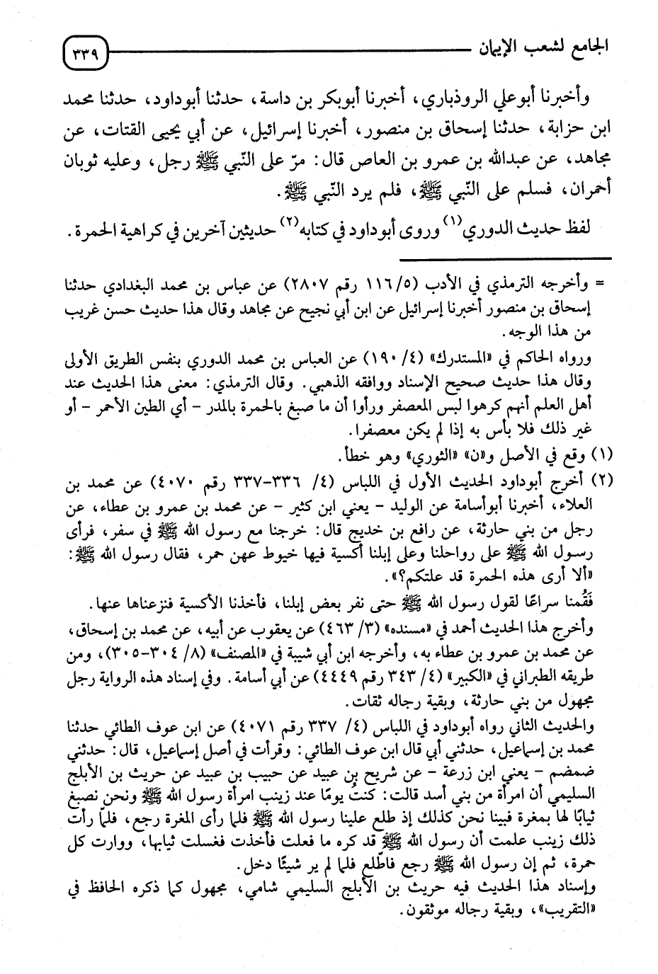 وَأَخْبَرَنَا أَبُو عَلِيٍّ الرُّوذْبَارِيُّ، أَنَا أَبُو بَكْرِ بْنُ دَاسَةَ، ثَنَا أَبُو دَاوُدَ، ثَنَا مُحَمَّدُ بْنُ حُزَابَةَ، ثَنَا إِسْحَاقُ بْنُ مَنْصُورٍ، أَنَا إِسْرَائِيلُ، عَنْ أَبِي يَحْيَى الْقَتَّاتِ، عَنْ مُجَاهِدٍ، عَنْ عَبْدِ اللهِ بْنِ عَمْرِو بْنِ الْعَاصِ، قَالَ: §" مَرَّ عَلَى النَّبِيِّ صَلَّى اللَّهُ عَلَيْهِ وَسَلَّمَ رَجُلٌ وَعَلَيْهِ ثَوْبَانِ أَحْمَرَانِ، فَسَلَّمَ عَلَى النَّبِيِّ صَلَّى اللَّهُ عَلَيْهِ وَسَلَّمَ، فَلَمْ يَرُدَّ النَّبِيُّ صَلَّى اللَّهُ عَلَيْهِ وَسَلَّمَ " " لَفْظَ حَدِيثِ الثَّوْرِيِّ وَرَوَى أَبُو دَاوُدَ فِي كِتَابِهِ حَدِيثَيْنِ آخَرَيْنِ فِي كَرَاهِيَةِ الْخُمْرَةِ -[340]- فَيُحْتَمَلُ أَنَّهُ إِنَّمَا كَرِهَهَا، إِذَا صُبِغَ بِهَا الثَّوْبُ بَعْدَ مَا يُنْسَجُ، فَأَمَّا مَا صُبِغَ غَزْلُهُ ثُمَّ نُسِجَ فَغَيْرُ دَاخِلٍ فِي الْكَرَاهِيَةِ "