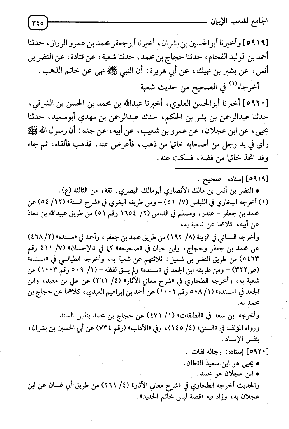 5919 - وَأَخْبَرَنَا أَبُو الْحُسَيْنِ بْنُ بِشْرَانَ، أَنَا أَبُو جَعْفَرٍ مُحَمَّدُ بْنُ عَمْرٍو الرَّزَّازُ، ثَنَا أَحْمَدُ بْنُ الْوَلِيدِ الْفَحَّامُ، ثَنَا حَجَّاجُ بْنُ مُحَمَّدٍ، ثَنَا شُعْبَةُ، عَنْ قَتَادَةَ، عَنِ النَّضْرِ بْنِ أَنَسٍ، عَنْ بَشِيرِ بْنِ نَهِيكٍ، عَنْ أَبِي هُرَيْرَةَ: " أَنَّ النَّبِيَّ صَلَّى اللَّهُ عَلَيْهِ وَسَلَّمَ §نَهَى عَنْ خَاتَمِ الذَّهَبِ " أَخْرَجَاهُ فِي الصَّحِيحِ مِنْ حَدِيثِ شُعْبَةَ