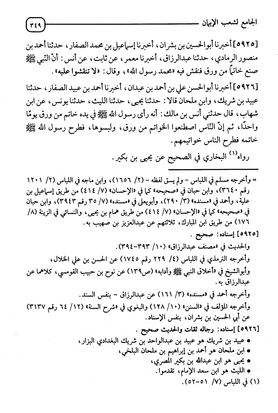 5925 - أَخْبَرَنَا أَبُو الْحُسَيْنِ بْنُ بِشْرَانَ، أَنَا إِسْمَاعِيلُ بْنُ مُحَمَّدٍ الصَّفَّارُ، ثَنَا أَحْمَدُ بْنُ مَنْصُورٍ الرَّمَادِيُّ، ثَنَا عَبْدُ الرَّزَّاقِ، ثَنَا مَعْمَرٌ، عَنْ ثَابِتٍ، عَنْ أَنَسِ بْنِ مَالِكٍ، أَنَّ النَّبِيَّ صَلَّى اللَّهُ عَلَيْهِ وَسَلَّمَ صَنَعَ خَاتَمًا مِنْ وَرِقٍ، فَنَقَشَ فِيهِ مُحَمَّدٌ رَسُولُ اللهِ وَقَالَ: §" لَا تَنْقُشُوا عَلَيْهِ "