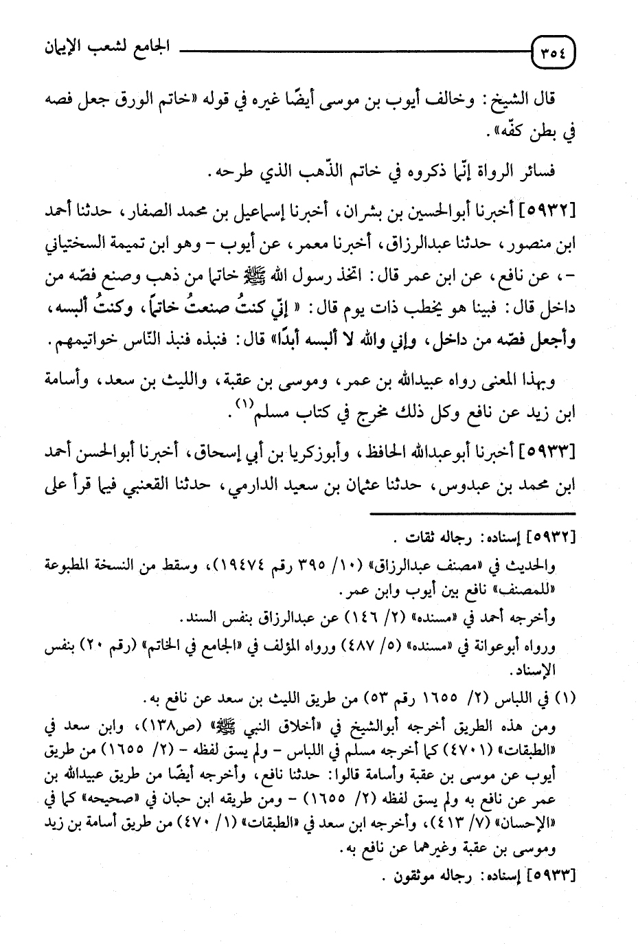 5932 - أَخْبَرَنَا أَبُو الْحُسَيْنِ بْنُ بِشْرَانَ، أَنَا إِسْمَاعِيلُ بْنُ مُحَمَّدٍ الصَّفَّارُ، ثَنَا أَحْمَدُ بْنُ مَنْصُورٍ، ثَنَا عَبْدُ الرَّزَّاقِ، أَنَا مَعْمَرٌ، عَنْ أَيُّوبَ وَهُوَ ابْنُ أَبِي تَمِيمَةَ السَّخْتِيَانِيُّ، عَنْ نَافِعٍ، عَنِ ابْنِ عُمَرَ قَالَ: اتَّخَذَ رَسُولُ اللهِ صَلَّى اللَّهُ عَلَيْهِ وَسَلَّمَ خَاتَمًا مِنْ ذَهَبٍ وَضَعَ فَصَّهُ مِنْ دَاخِلٍ قَالَ فَبَيْنَمَا هُوَ يَخْطُبُ ذَاتَ يَوْمٍ قَالَ: " إِنِّي كُنْتُ §صَنَعْتُ خَاتَمًا، وَكُنْتُ أَلْبَسُهُ وَأَجْعَلُ فَصَّهُ مِنْ دَاخِلٍ، وَإِنِّي وَاللهِ لَا أَلْبَسُهُ أَبَدًا " قَالَ: فَنَبَذَ النَّاسُ خَوَاتِيمَهُمْ. وَبِهَذَا الْمَعْنَى رَوَاهُ عُبَيْدُ اللهِ بْنُ عُمَرَ، وَمُوسَى بْنُ عُقْبَةَ وَاللَّيْثُ بْنُ سَعْدٍ وَأُسَامَةُ بْنُ زَيْدٍ، عَنْ نَافِعٍ وَكُلُّ ذَلِكَ مُخَرَّجٌ فِي كِتَابِ مُسْلِمٍ