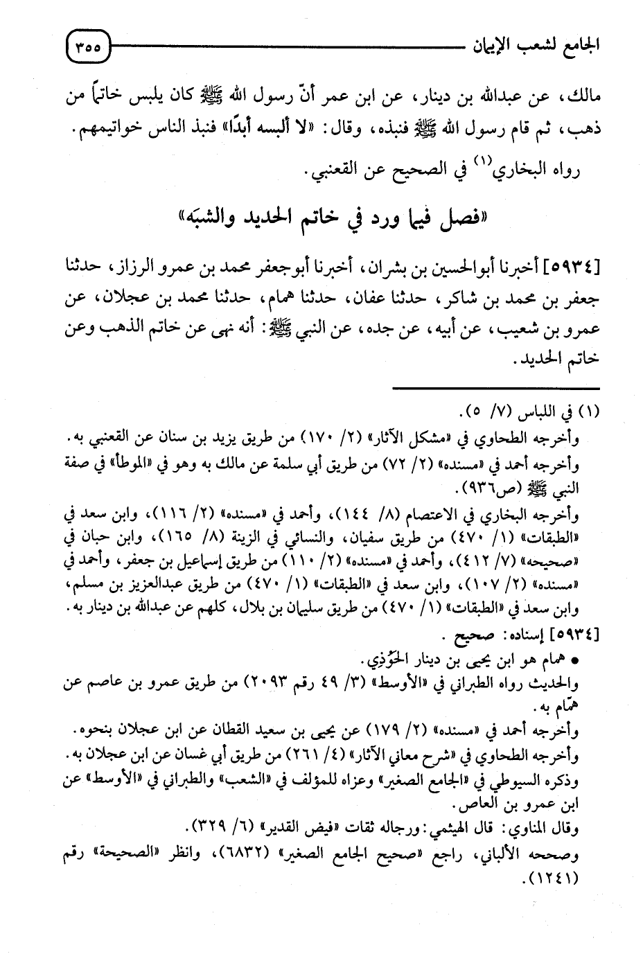5934 - أَخْبَرَنَا أَبُو الْحُسَيْنِ بْنُ بِشْرَانَ، أَنَا أَبُو جَعْفَرٍ مُحَمَّدُ بْنُ عَمْرٍو الرَّزَّازُ، ثَنَا جَعْفَرُ بْنُ مُحَمَّدِ بْنِ شَاكِرٍ، ثَنَا عَفَّانُ، ثَنَا هَمَّامٌ، ثَنَا مُحَمَّدُ بْنُ عَجْلَانَ، عَنْ عَمْرِو بْنِ شُعَيْبٍ، عَنْ أَبِيهِ، عَنْ جَدِّهِ، عَنِ النَّبِيِّ صَلَّى اللَّهُ عَلَيْهِ وَسَلَّمَ أَنَّهُ: §" نَهَى عَنْ خَاتَمِ الذَّهَبِ وَعَنْ خَاتَمِ الْحَدِيدِ "
