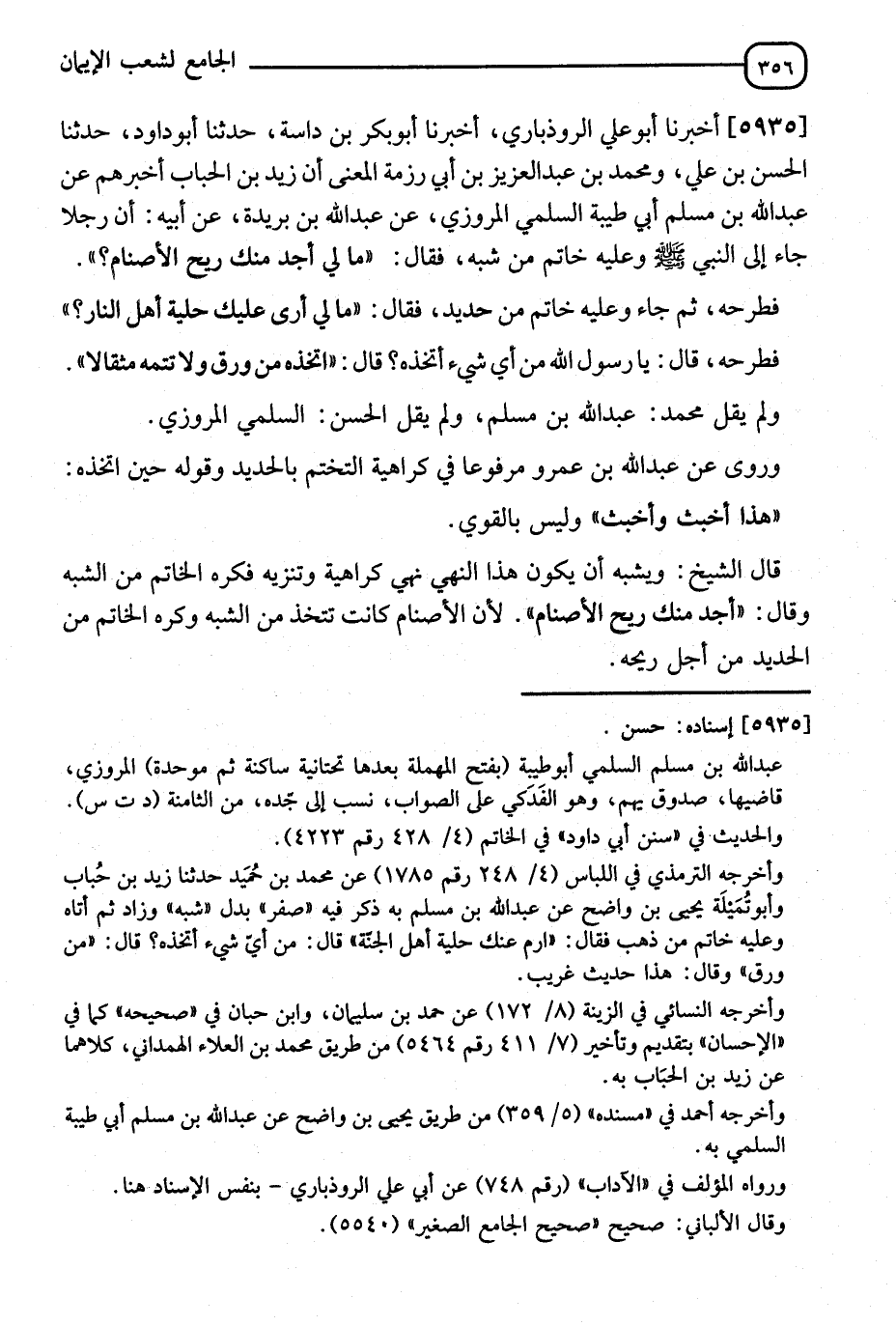 5935 - أَخْبَرَنَا أَبُو عَلِيٍّ الرُّوذْبَارِيُّ، أَنَا أَبُو بَكْرِ بْنُ دَاسَةَ، ثَنَا أَبُو دَاوُدُ، ثَنَا الْحَسَنُ بْنُ عَلِيٍّ، وَمُحَمَّدُ بْنُ عَبْدِ الْعَزِيزِ بْنِ أَبِي رُزْمَةَ الْمَعْنِيُّ، أَنَّ زَيْدَ بْنَ الْحُبَابِ، أَخْبَرَهُمْ عَنْ عَبْدِ اللهِ بْنِ مُسْلِمٍ أَبِي طَيْبَةَ السَّلَمِيِّ الْمَرْوَزِيِّ، عَنْ عَبْدِ اللهِ بْنِ بُرَيْدَةَ، عَنْ أَبِيهِ، أَنَّ رَجُلًا جَاءَ إِلَى النَّبِيِّ صَلَّى اللَّهُ عَلَيْهِ وَسَلَّمَ، وَعَلَيْهِ خَاتَمٌ مِنْ شُبِّهَ فَقَالَ: مَا لِي أَجِدُ مِنْكَ رِيحَ الْأَصْنَامِ فَطَرَحَهُ، ثُمَّ جَاءَ وَعَلَيْهِ خَاتَمٌ مِنْ حَدِيدٍ فَقَالَ: مَا لِي أَرَى عَلَيْكَ حِلْيَةَ أَهْلِ النَّارِ فَطَرَحَهُ فَقَالَ: يَا رَسُولَ اللهِ مِنْ أَيِّ شَيْءٍ أتَّخِذَهُ؟ قَالَ: §" اتَّخِذْهُ مِنْ وَرِقٍ وَلَا تُتِمَّهُ مِثْقَالًا " وَلَمْ يَقُلْ مُحَمَّدٌ عَبْدُ اللهِ بْنُ مُسْلِمٍ وَلَمْ يَقُلْ الْحَسَنُ السَّلَمِيُّ الْمَرْوَزِيُّ