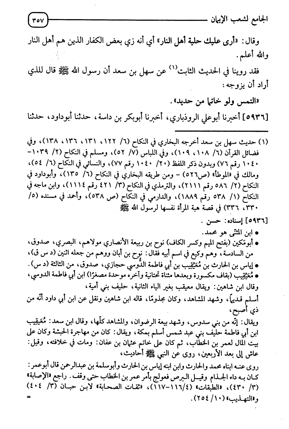 5936 - أَخْبَرَنَا أَبُو عَلِيٍّ الرُّوذْبَارِيُّ، ثَنَا أَبُو بَكْرِ بْنُ دَاسَةِ، أَنَا أَبُو دَاوُدَ، ثَنَا -[358]- ابْنُ الْمُثَنَّى، وَزِيَادُ بْنُ يَحْيَى، وَالْحَسَنُ بْنُ عَلِيٍّ، ثَنَا سَهْلُ بْنُ حَمَّادٍ أَبُو عَتَّابٍ، ثَنَا أَبُو مَكِينٍ نُوحُ بْنُ رَبِيعَةَ، حَدَّثَنِي إِيَاسُ بْنُ الْحَارِثِ بْنِ الْمُعَيْقِيبِ، وَجَدُّهُ مِنْ قِبَلِ أُمِّهِ أَبُو ذُبَابٍ، عَنْ جَدِّهِ قَالَ: " كَانَ §خَاتَمُ النَّبِيِّ صَلَّى اللَّهُ عَلَيْهِ وَسَلَّمَ مِنْ حَدِيدٍ مَلْوِيٍّ عَلَيْهِ فِضَّةٌ " قَالَ فَرُبَّمَا كَانَ فِي يَدِهِ وَقَالَ وَكَانَ الْمُعَيْقِيبُ عَلَى خَاتَمِ النَّبِيِّ صَلَّى اللَّهُ عَلَيْهِ وَسَلَّمَ. وَرَوَاهُ مُحَمَّدُ بْنُ بَشَّارٍ، عَنْ سَهْلٍ وَقَالَ جَدُّهُ الْمُعَيْقِيبُ وَقَالَ: فَرُبَّمَا كَانَ فِي يَدِي وَهَذَا لِأَنَّ بِالْفِضَّةِ الَّتِي لُوِيَتْ عَلَيْهِ لَا يُوجَدُ رِيحُ الْحَدِيدِ فَيُشْبِهُ أَنْ تَرْتَفِعَ الْكَرَاهِيَةُ بِذَلِكَ. وَرُوِّينَا عَنِ ابْنِ مَسْعُودٍ أَنَّهُ رُئِيَ وَفِي يَدِهِ خَاتَمٌ مِنْ حَدِيدٍ وَرُوِّينَا عَنْ عُمَرَ بْنِ الْخَطَّابِ أَنَّهُ كَرِهَهُ