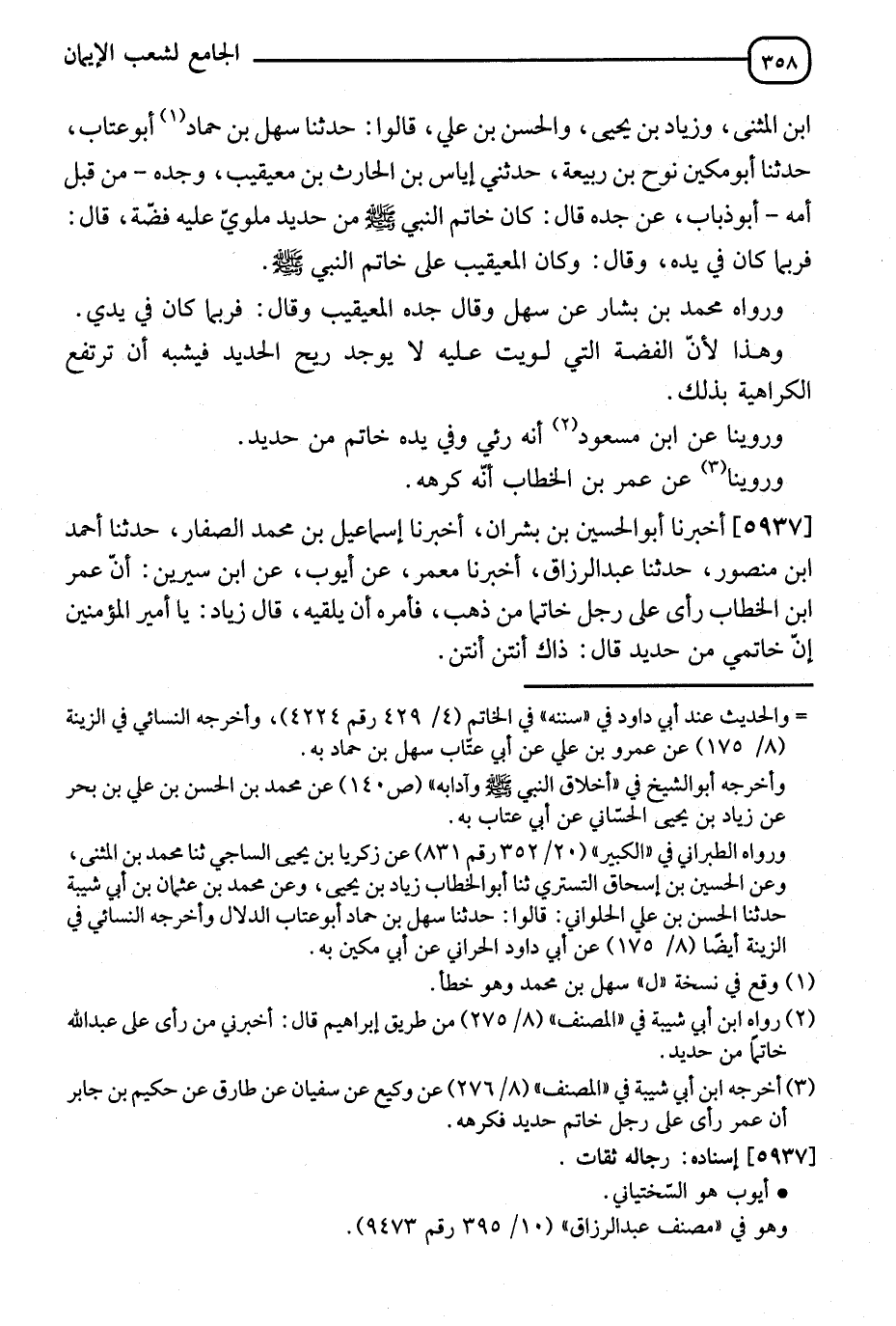 5937 - أَخْبَرَنَا أَبُو الْحُسَيْنِ بْنُ بِشْرَانَ، أَنَا إِسْمَاعِيلُ بْنُ مُحَمَّدٍ الصَّفَّارُ، ثَنَا أَحْمَدُ بْنُ مَنْصُورٍ، ثَنَا عَبْدُ الرَّزَّاقِ، أَنَا مَعْمَرٌ، عَنْ أَيُّوبَ، عَنِ ابْنِ سِيرِينِ، أَنَّ عُمَرَ بْنَ الْخَطَّابِ رَأَى عَلَيَّ خَاتَمًا مِنْ ذَهَبٍ، فَأَمَرَهُ أَنْ يُلْقِيَهُ قَالَ زِيَادٌ: يَا أَمِيرَ الْمُؤْمِنِينَ إِنَّ خَاتَمِي مِنْ حَدِيدٍ قَالَ: §" ذَاكَ أَنْتَنُ وَأَنْتَنُ "