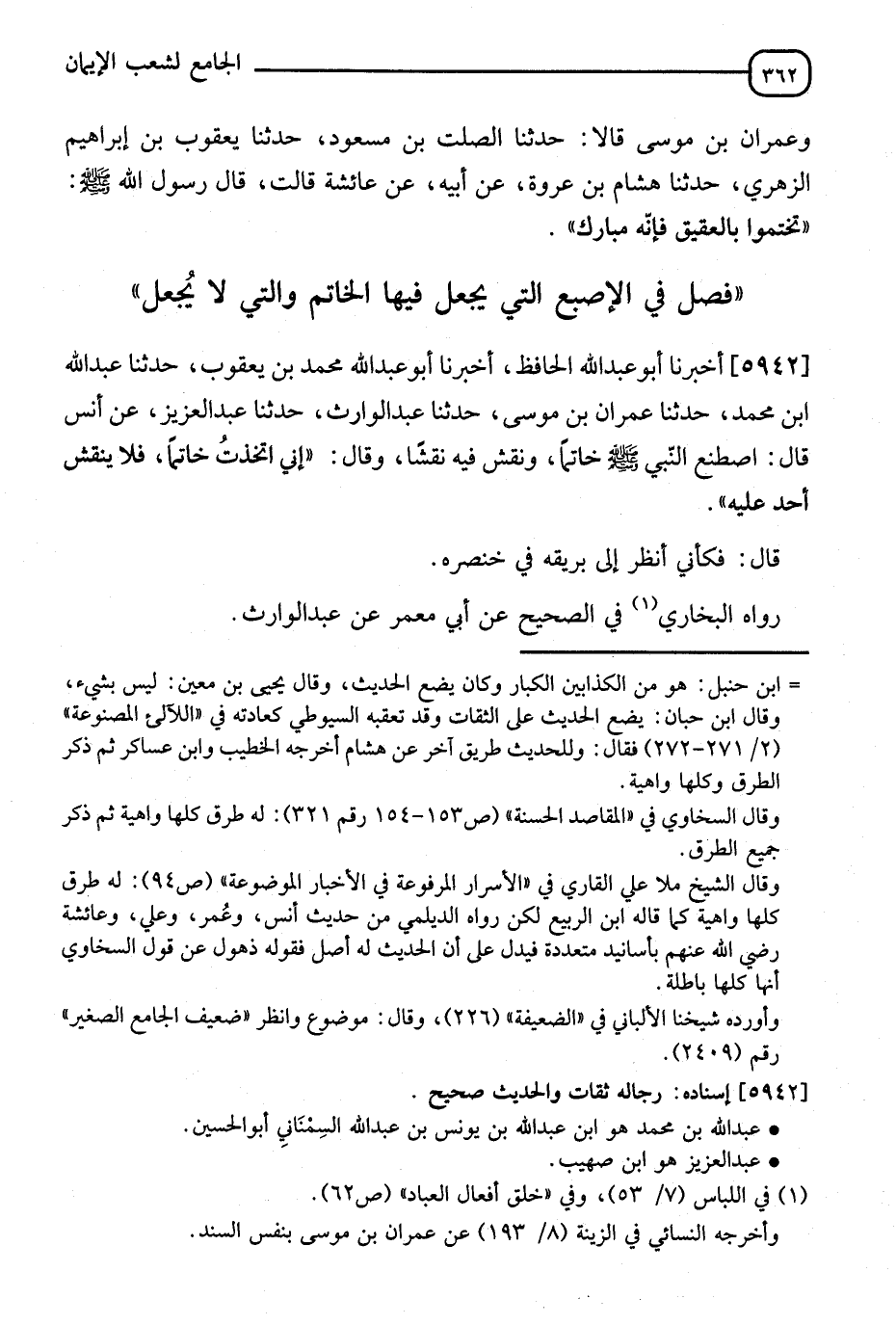 5942 - أَخْبَرَنَا أَبُو عَبْدِ اللهِ الْحَافِظُ، أَنَا أَبُو عَبْدِ اللهِ مُحَمَّدُ بْنُ يَعْقُوبَ، ثَنَا عَبْدُ اللهِ بْنُ مُحَمَّدٍ، ثَنَا عِمْرَانُ بْنُ مُوسَى، ثَنَا عَبْدُ الْوَارِثِ، ثَنَا عَبْدُ الْعَزِيزِ، عَنْ أَنَسٍ قَالَ: اصْطَنَعَ النَّبِيُّ صَلَّى اللَّهُ عَلَيْهِ وَسَلَّمَ خَاتَمًا وَنَقَشَ فِيهِ نَقْشًا وَقَالَ: " إِنِّي §اتَّخَذْتُ خَاتَمًا فَلَا يَنْقُشْ أَحَدٌ عَلَيْهِ " قَالَ: فَكَأَنِّي أَنْظُرُ إِلَى بَرِيقِهِ فِي خِنْصَرِهِ رَوَاهُ الْبُخَارِيُّ فِي الصَّحِيحِ عَنْ أَبِي مَعْمَرٍ عَنْ عَبْدِ الْوَارِثِ
