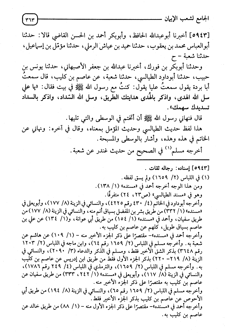 5943 - أَخْبَرَنَا أَبُو عَبْدِ اللهِ الْحَافِظُ، وَأَبُو بَكْرٍ أَحْمَدُ بْنُ الْحَسَنِ الْقَاضِي، ثَنَا أَبُو الْعَبَّاسِ مُحَمَّدُ بْنُ يَعْقُوبَ، ثَنَا حُمَيْدُ بْنُ عَيَّاشٍ الرَّمْلِيُّ، ثَنَا مُؤَمَّلُ بْنُ إِسْمَاعِيلَ، ثَنَا شُعْبَةُ، ح، وَحَدَّثَنَا أَبُو بَكْرِ بْنُ فُورَكٍ، أَنَا عَبْدُ اللهِ بْنُ جَعْفَرٍ الْأَصْبَهَانِيُّ، ثَنَا يُونُسُ بْنُ حَبِيبٍ، ثَنَا أَبُو دَاوُدَ الطَّيَالِسِيُّ، ثَنَا شُعْبَةُ، عَنْ عَاصِمِ بْنِ كُلَيْبٍ، قَالَ: سَمِعْتُ أَبَا بُرْدَةَ، يَقُولُ: سَمِعْتُ عَلِيًّا يَقُولُ: كُنْتُ مَعَ رَسُولِ اللهِ صَلَّى اللَّهُ عَلَيْهِ وَسَلَّمَ فِي بَيْتٍ فَقَالَ: " يَا عَلِيُّ §سَلِ الْهُدَى وَاذْكُرْ بِالْهُدَى هِدَايَتَكَ الطَّرِيقَ، وَسَلِ اللهَ السَّدَادَ وَاذْكُرْ بِالسَّدَادِ تَسْدِيدَكَ السَّهْمَ "