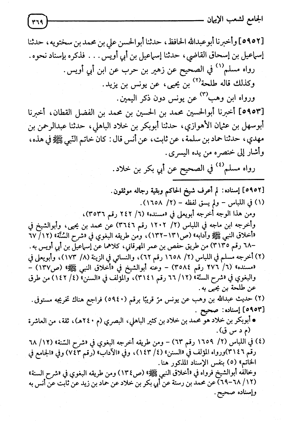 5953 - وَأَخْبَرَنَا أَبُو الْحُسَيْنِ مُحَمَّدُ بْنُ الْحُسَيْنِ بْنِ مُحَمَّدِ بْنِ الْفَضْلِ الْقَطَّانُ، أَنَا أَبُو سَهْلٍ أَحْمَدُ بْنُ مُحَمَّدِ بْنِ عَبْدِ اللهِ بْنِ زِيَادٍ الْقَطَّانُ، ثَنَا سَعِيدُ بْنُ عُثْمَانَ الْأَهْوَازِيُّ، ثَنَا أَبُو بَكْرِ بْنُ خَلَّادٍ الْبَاهِلِيُّ، ثَنَا عَبْدُ الرَّحْمَنِ بْنُ مَهْدِيٍّ، ثَنَا حَمَّادُ بْنُ سَلَمَةَ، عَنْ ثَابِتٍ، عَنْ أَنَسٍ قَالَ: " كَانَ §خَاتَمُ النَّبِيِّ صَلَّى اللَّهُ عَلَيْهِ وَسَلَّمَ فِي هَذِهِ " وَأَشَارَ إِلَى خِنْصَرِهِ مِنْ يَدِهِ الْيُسْرَى رَوَاهُ مُسْلِمٌ عَنْ أَبِي بَكْرِ بْنِ خَلَّادٍ. -[370]- قَالَ الشَّيْخُ: " وَقَدْ رَوَيْنَاهُ فِي كِتَابِ السُّنَنِ مِنْ حَدِيثِ أَبِي الْوَلِيدِ عَنْ حَمَّادٍ عَالِيًا "