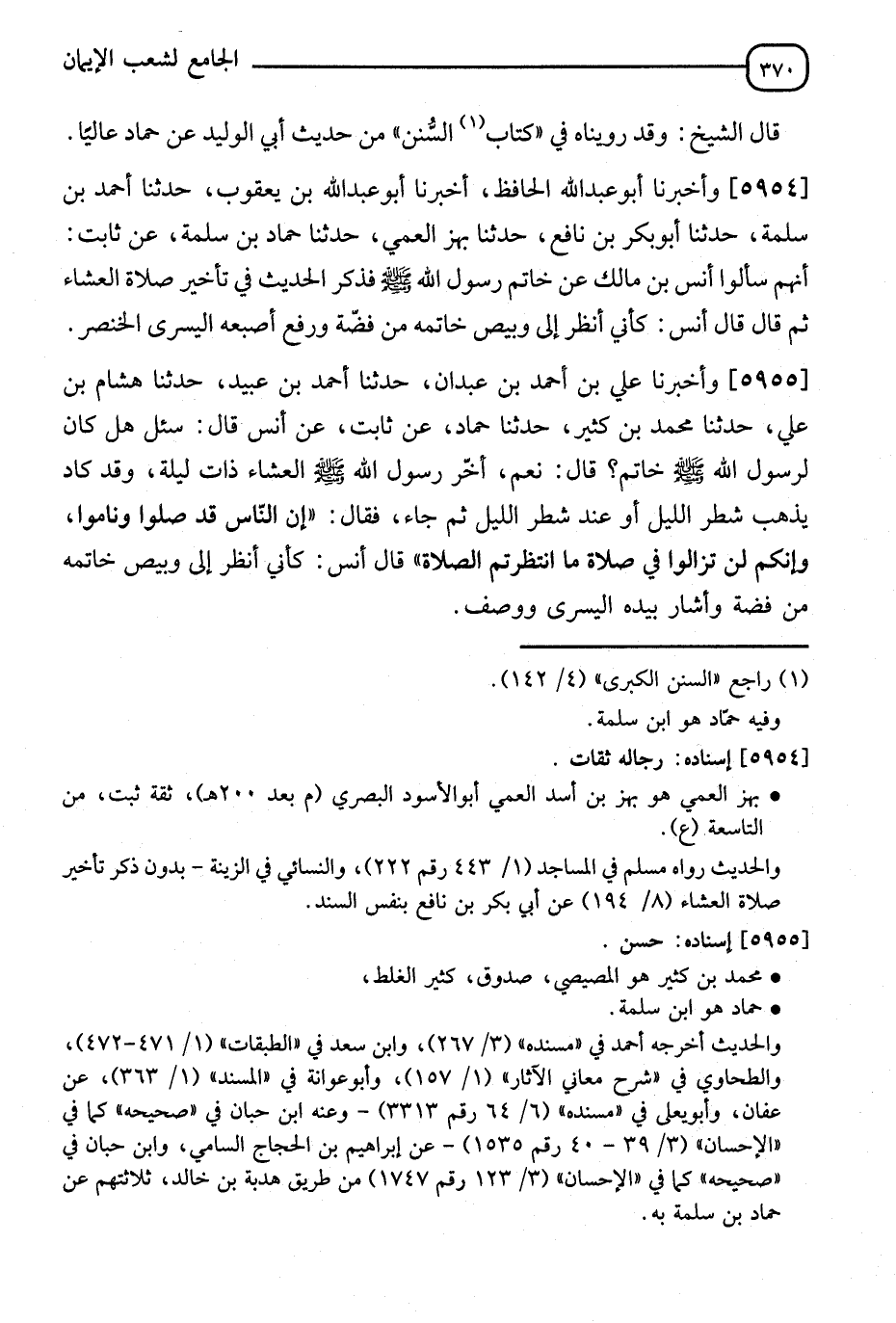 5955 - وَأَخْبَرَنَا عَلِيُّ بْنُ أَحْمَدَ بْنِ عَبْدَانَ، أَنَا أَحْمَدُ بْنُ عُبَيْدٍ، ثَنَا هِشَامُ بْنُ عَلِيٍّ، ثَنَا مُحَمَّدُ بْنُ كَثِيرٍ، ثَنَا حَمَّادٌ، عَنْ ثَابِتٍ، عَنْ أَنَسٍ قَالَ: سُئِلَ هَلْ كَانَ لِرَسُولِ اللهِ صَلَّى اللَّهُ عَلَيْهِ وَسَلَّمَ خَاتَمٌ؟ قَالَ: نَعَمْ أَخَّرَ رَسُولُ اللهِ صَلَّى اللَّهُ عَلَيْهِ وَسَلَّمَ الْعِشَاءَ ذَاتَ لَيْلَةٍ، وَقَدْ كَادَ يَذْهَبُ شَطْرُ اللَّيْلِ أَوْ عِنْدَ شَطْرِ اللَّيْلِ ثُمَّ جَاءَ فَقَالَ: " إِنَّ §النَّاسَ قَدْ صَلُّوا وَنَامُوا وَإِنَّكُمْ لَنْ تَزَالُوا فِي صَلَاةٍ مَا انْتَظَرْتُمُ الصَّلَاةَ " قَالَ أَنَسٌ: كَأَنِّي أَنْظُرُ إِلَى وَبِيصِ خَاتَمِهِ مِنْ فِضَّةٍ، وَأَشَارَ بِيَدِهِ الْيُسْرَى وَوَصَفَ -[371]- قَالَ الشَّيْخُ: " وَهَذَا أَصَحُّ مِنْ رِوَايَةِ الزُّهْرِيِّ، عَنْ أَنَسٍ أَنَّهُ طَرَحَ مَا اتَّخَذَهُ مِنْ وَرِقٍ، وَذَلِكَ غَلَطٌ بَالْإِجْمَاعِ فَيُشْبِهُ أَنْ يَكُونَ ذَكَرَ الْيَمِينَ فِي الَّذِي اتَّخَذَهُ مِنْ ذَهَبٍ، وَهُوَ الَّذِي طَرَحَهُ كَمَا رَوَيْنَا مِنْ حَدِيثِ ابْنِ عُمَرَ "
