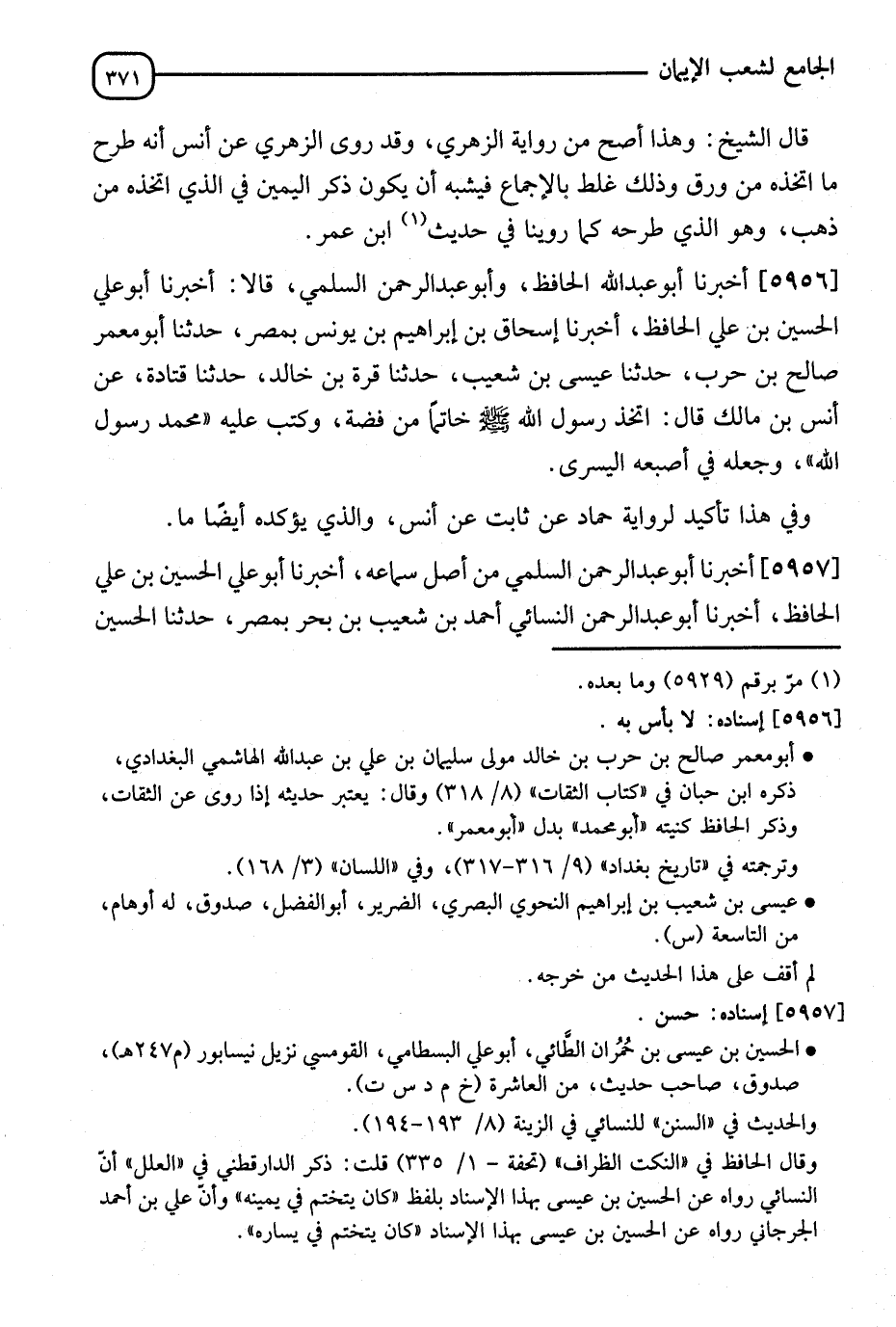 5956 - أَخْبَرَنَا أَبُو عَبْدِ اللهِ الْحَافِظُ، وَأَبُو عَبْدِ الرَّحْمَنِ السُّلَمِيُّ، أَنَا أَبُو عَلِيٍّ الْحُسَيْنُ بْنُ عَلِيٍّ الْحَافِظُ، أَنَا إِسْحَاقُ بْنُ إِبْرَاهِيمَ بْنِ يُونُسَ، بِمِصْرَ، ثَنَا أَبُو مَعْمَرٍ صَالِحُ بْنُ حَرْبٍ، ثَنَا عِيسَى بْنُ شُعَيْبَ، ثَنَا قُرَّةُ بْنُ خَالِدٍ، ثَنَا قَتَادَةُ، عَنْ أَنَسِ بْنِ مَالِكٍ قَالَ: §" اتَّخَذَ رَسُولُ اللهِ صَلَّى اللَّهُ عَلَيْهِ وَسَلَّمَ خَاتَمًا مِنْ فِضَّةٍ وَكَتَبَ عَلَيْهِ مُحَمَّدٌ رَسُولُ اللهِ صَلَّى اللَّهُ عَلَيْهِ وَسَلَّمَ وَجَعَلَهُ فِي إِصْبَعِهِ الْيُسْرَى " " وَفِي هَذَا تَأْكِيدٌ لِرِوَايَةِ حَمَّادٍ، عَنْ ثَابِتٍ، عَنْ أَنَسٍ وَالَّذِي يُؤَكِّدُهُ أَيْضًا مَا "