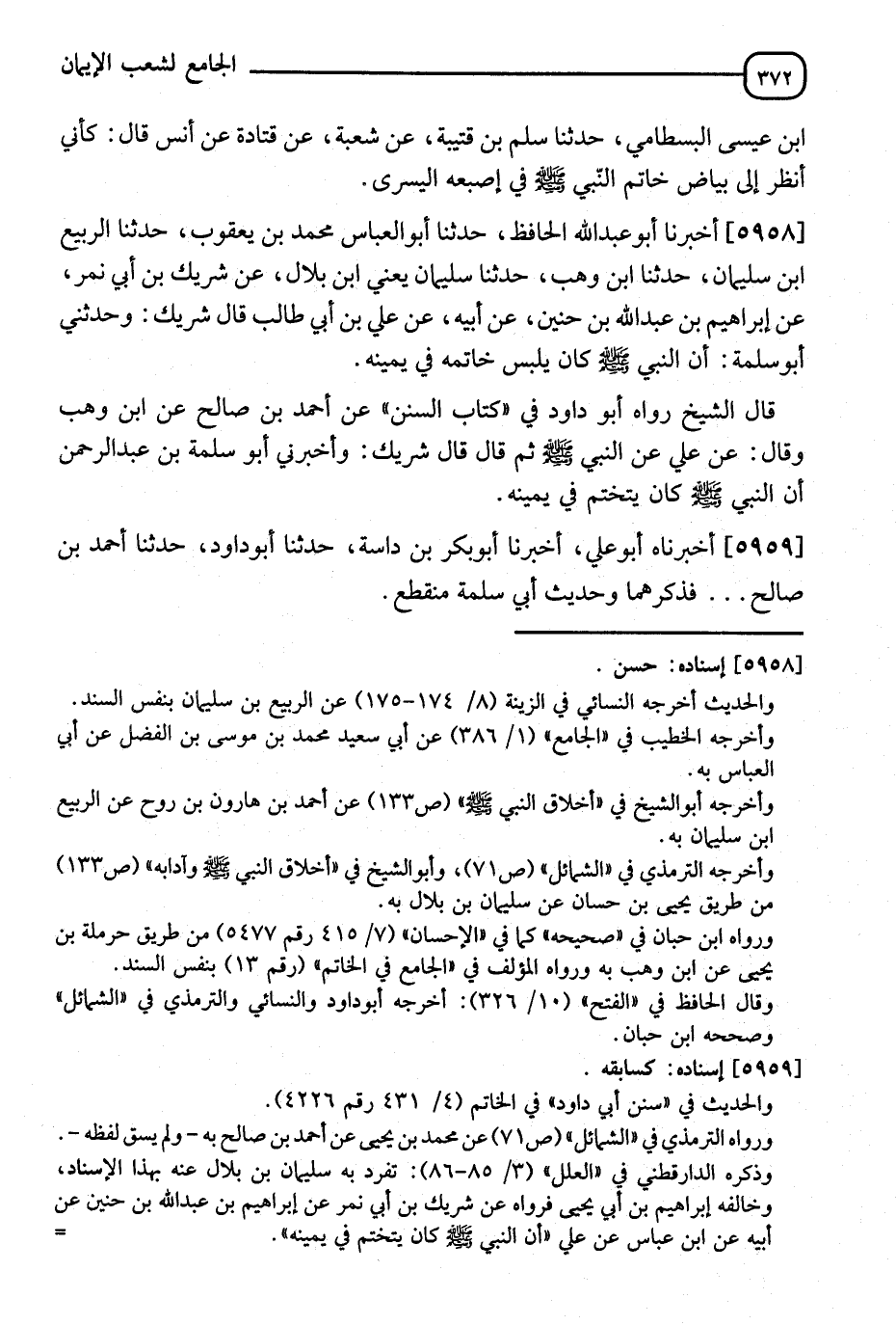 5958 - أَخْبَرَنَا أَبُو عَبْدِ اللهِ الْحَافِظُ، ثَنَا أَبُو الْعَبَّاسِ مُحَمَّدُ بْنُ يَعْقُوبَ، ثَنَا الرَّبِيعُ بْنُ سُلَيْمَانَ، ثَنَا ابْنُ وَهْبٍ، ثَنَا سُلَيْمَانُ يَعْنِي ابْنَ بِلَالٍ، عَنْ شَرِيكِ بْنِ أَبِي نَمِرٍ، عَنْ إِبْرَاهِيمَ بْنِ عَبْدِ اللهِ بْنِ حُنَيْنٍ، عَنْ أَبِيهِ، عَنْ عَلِيِّ بْنِ أَبِي طَالِبٍ قَالَ: شَرِيكٌ، وَحَدَّثَنِي أَبُو سَلَمَةَ: " أَنَّ النَّبِيَّ صَلَّى اللَّهُ عَلَيْهِ وَسَلَّمَ كَانَ §يَلْبَسُ خَاتَمَهُ فِي يَمِينِهِ " قَالَ الشَّيْخُ: " رَوَاهُ أَبُو دَاوُدَ فِي كِتَابِ السُّنَنِ عَنْ أَحْمَدَ بْنِ صَالِحٍ عَنِ ابْنِ وَهْبٍ، وَقَالَ: عَنْ عَلِيٍّ عَنِ النَّبِيِّ صَلَّى اللَّهُ عَلَيْهِ وَسَلَّمَ ثُمَّ قَالَ: قَالَ شَرِيكٌ: وَأَخْبَرَنِي أَبُو سَلَمَةَ بْنُ عَبْدِ الرَّحْمَنِ أَنَّ النَّبِيَّ صَلَّى اللَّهُ عَلَيْهِ وَسَلَّمَ كَانَ يَتَخَتَّمُ فِي يَمِينِهِ "