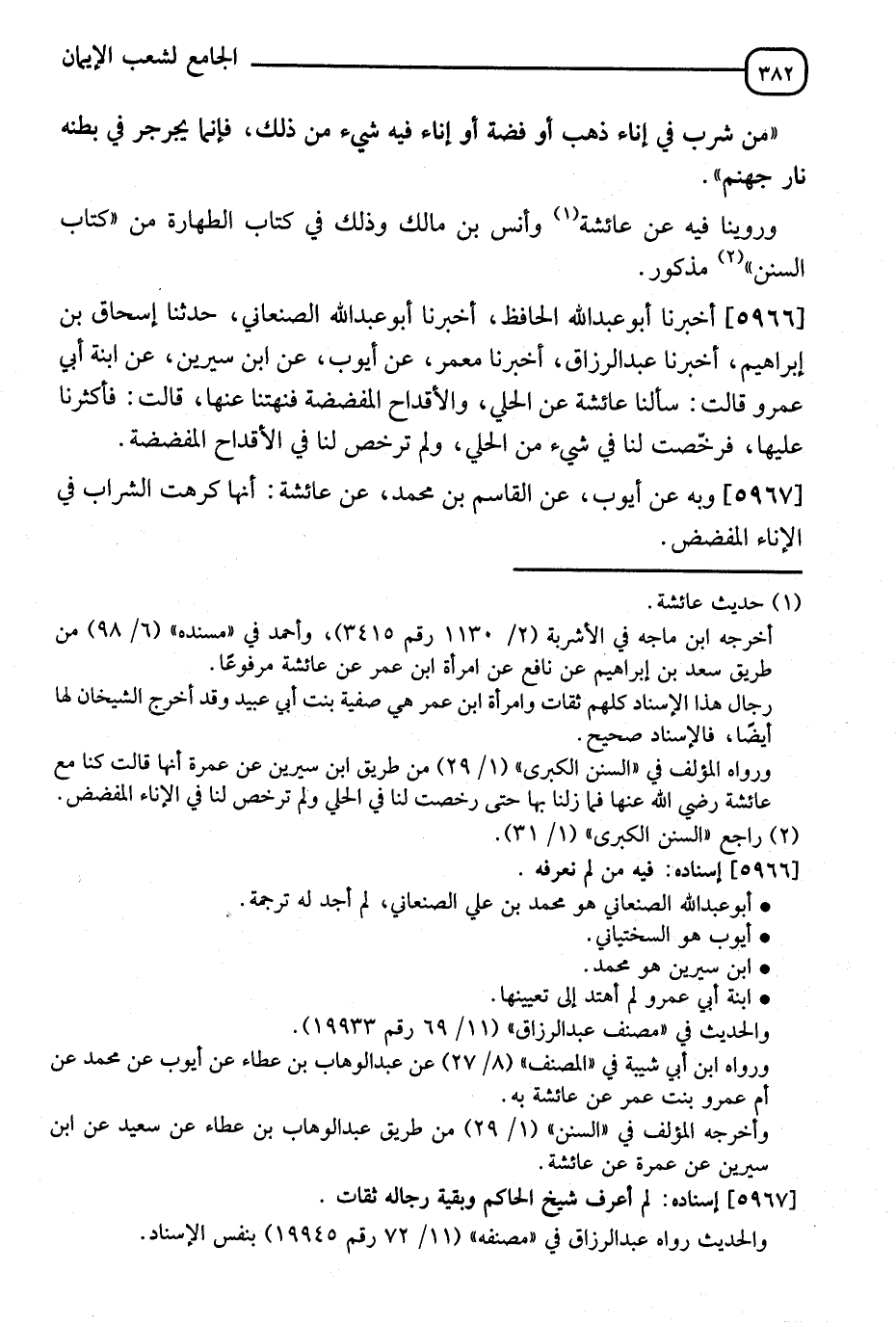 5966 - أَخْبَرَنَا أَبُو عَبْدِ اللهِ الْحَافِظُ، أَنَا أَبُو عَبْدِ اللهِ الصَّنْعَانِيُّ، ثَنَا إِسْحَاقُ بْنُ إِبْرَاهِيمَ، أَنَا عَبْدُ الرَّزَّاقِ، أَنَا مَعْمَرٌ، عَنْ أَيُّوبَ، عَنِ ابْنِ سِيرِينَ، عَنْ بِنْتِ أَبِي عَمْرٍو، قَالَتْ: " سَأَلْنَا عَائِشَةَ عَنِ الْحُلِيِّ وَالْأَقْدَاحِ الْمُفَضَّضَةِ §فَنَهَتْنَا عَنْهَا قَالَتْ: فَأَكْثَرْنَا عَلَيْهَا فَرَخَّصَتْ لَنَا فِي الشَّيْءِ مِنَ الْحُلِيِّ، وَلَمْ تُرَخِّصْ لَنَا فِي الْأَقْدَاحِ الْمُفَضَّضَةِ "