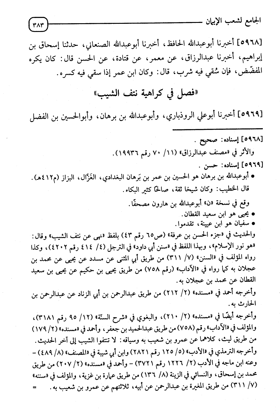 5969 - أَخْبَرَنَا أَبُو عَلِيٍّ الرُّوذْبَارِيُّ وَهُوَ عَبْدُ اللهِ بْنُ بُرْهَانَ، وَأَبُو الْحُسَيْنِ بْنُ الْفَضْلِ -[384]- الْقَطَّانُ، أَنَا إِسْمَاعِيلُ بْنُ مُحَمَّدٍ الصَّفَّارُ، ثَنَا الْحَسَنُ بْنُ عَرَفَةَ، ثَنَا إِسْمَاعِيلُ بْنُ عَيَّاشٍ، عَنْ عَبْدِ الرَّحْمَنِ بْنِ الْحَارِثِ، عَنْ عَمْرِو بْنِ شُعَيْبٍ، ح وَأَخْبَرَنَا أَبُو عَلِيٍّ الرُّوذْبَارِيُّ، أَنَا أَبُو بَكْرِ بْنُ دَاسَةَ، عَنْ أَبِي دَاوُدَ، ثَنَا مُسَدَّدٌ، ثَنَا يَحْيَى، وَسُفْيَانُ الْمَعْنَى، عَنِ ابْنِ عَجْلَانَ، عَنْ عَمْرِو بْنِ شُعَيْبٍ، عَنْ أَبِيهِ، عَنْ جَدِّهِ قَالَ: قَالَ رَسُولُ اللهِ صَلَّى اللَّهُ عَلَيْهِ وَسَلَّمَ: §" لَا تَنْتِفُوا الشَّيْبَ، مَا مِنْ مُسْلِمٍ يَشِيبُ شَيْبَةً فِي الْإِسْلَامِ " قَالَ عَنْ سُفْيَانَ: " إِلَّا كَانَتْ لَهُ نُورًا يَوْمَ الْقِيَامَةِ " وَقَالَ فِي حَدِيثِ يَحْيَى: " إِلَّا كَتَبَ اللهُ لَهُ بِهَا حَسَنَةً وَحَطَّ عَنْهُ بِهَا خَطِيئَةً "