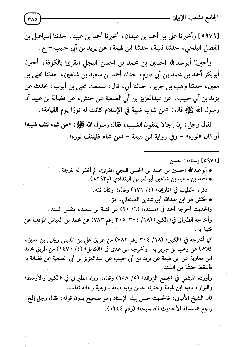 5971 - أَخْبَرَنَا عَلِيُّ بْنُ أَحْمَدَ بْنِ عَبْدَانَ، أَنَا أَحْمَدُ بْنُ عُبَيْدٍ، ثَنَا إِسْمَاعِيلُ بْنُ الْفَضْلِ الْبَلْخِيُّ، ثَنَا قُتَيْبَةُ، ثَنَا ابْنُ لَهِيعَةَ، عَنْ يَزِيدَ بْنِ أَبِي حَبِيبٍ، ح وَأَخْبَرَنَا أَبُو عَبْدِ اللهِ الْحُسَيْنُ بْنُ مُحَمَّدِ بْنِ الْحَسَنِ الْبَجَلِيُّ الْمُقْرِئُ، بِالْكُوفَةِ، أَنَا أَبُو بَكْرٍ أَحْمَدُ بْنُ مُحَمَّدِ بْنِ أَبِي دَارِمٍ، ثَنَا أَحْمَدُ بْنُ سَعِيدِ بْنِ شَاهِينَ، ثَنَا يَحْيَى بْنُ مَعِينٍ، ثَنَا وَهْبُ بْنُ جَرِيرٍ، ثَنَا أَبِي قَالَ: سَمِعْتُ يَحْيَى بْنَ أَيُّوبَ، يُحَدِّثُ عَنْ يَزِيدَ بْنِ أَبِي حَبِيبٍ، عَنْ عَبْدِ الْعَزِيزِ بْنِ أَبِي الصَّعْبَةِ، عَنْ حَنَشٍ، عَنْ فَضَالَةَ بْنِ عُبَيْدٍ، أَنَّ رَسُولَ اللهِ صَلَّى اللَّهُ عَلَيْهِ وَسَلَّمَ قَالَ: " مَنْ §شَابَ شَيْبَةً فِي الْإِسْلَامِ، كَانَتْ لَهُ نُورًا يَوْمَ الْقِيَامَةِ " فَقَالَ رَجُلٌ: إِنَّ رِجَالًا يَنْتِفُونَ الشَّيْبَ فَقَالَ رَسُولُ اللهِ صَلَّى اللَّهُ عَلَيْهِ وَسَلَّمَ: " مَنْ شَاءَ نَتَفَ شِيبَهُ أَوْ قَالَ نُورَهُ " وَفِي رِوَايَةِ ابْنِ لَهِيعَةَ مَنْ شَاءَ فَلْيَنْتِفْ نُورَهُ