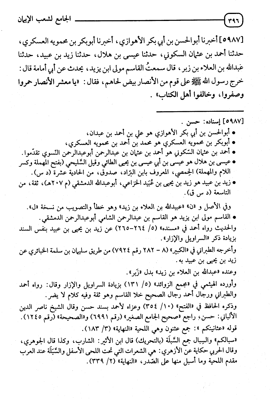 5987 - أَخْبَرَنَا أَبُو الْحَسَنِ بْنُ أَبِي بَكْرٍ الْأَهْوَازِيُّ، أَنَا أَبُو بَكْرِ بْنُ مَحْمَوَيْهِ الْعَسْكَرِيُّ، ثَنَا أَحْمَدُ بْنُ عُثْمَانَ السَّكُونِيُّ، ثَنَا عِيسَى بْنُ هِلَالٍ، ثَنَا يَزِيدُ بْنُ عُبَيْدٍ، ثَنَا عَبْدُ اللهِ بْنُ الْعَلَاءِ بْنِ زَبْرٍ، قَالَ: سَمِعْتُ الْقَاسِمَ، مَوْلَى ابْنِ يَزِيدَ، يُحَدِّثُ عَنْ أَبِي أُمَامَةَ قَالَ: خَرَجَ رَسُولُ اللهِ صَلَّى اللَّهُ عَلَيْهِ وَسَلَّمَ عَلَى قَوْمٍ مِنَ الْأَنْصَارِ بِيضٍ لِحَاهُمْ، فَقَالَ: " يَا مَعْشَرَ الْأَنْصَارِ حَمِّرُوا وَصَفِّرُوا وَخَالِفُوا أَهْلَ الْكِتَابِ " -[397]- فَقَالُوا: يَا رَسُولَ اللهِ إِنَّ أَهْلَ الْكِتَابِ يَقُصُّونَ عَثَانِينَهُمْ وَيُوَفِّرُونَ سِبَالَهُمْ، فَقَالَ رَسُولُ اللهِ صَلَّى اللَّهُ عَلَيْهِ وَسَلَّمَ: " §وَفِّرُوا عَثَانِينَكُمْ وَقَصِّرُوا سِبَالَكُمْ " فَقَالُوا: يَا رَسُولَ اللهِ إِنَّ أَهْلَ الْكِتَابِ يُخَفِّفُونَ وَلَا يَنْتَعِلُونَ، قَالَ: " انْتَعِلُوا وَتَخَفَّفُوا وَخَالِفُوا أَهْلَ الْكِتَابِ "