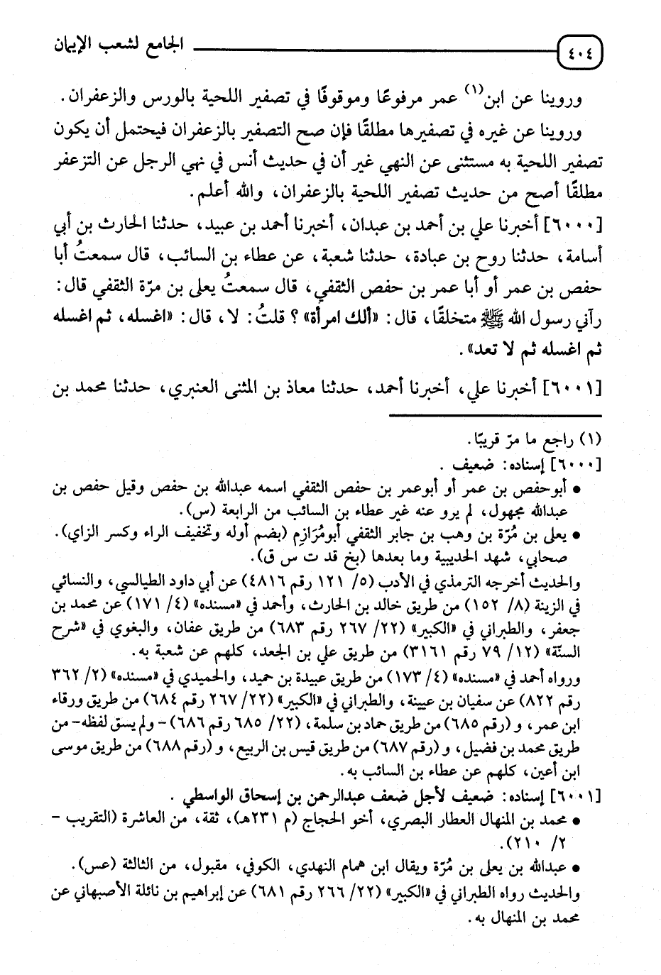 6001 - أَخْبَرَنَا عَلِيٌّ، أَنَا أَحْمَدُ، ثَنَا مُعَاذُ بْنُ الْمُثَنَّى الْعَنْبَرِيُّ، ثَنَا مُحَمَّدُ بْنُ -[405]- الْمِنْهَالِ، ثَنَا عَبْدُ الْوَاحِدِ، ثَنَا عَبْدُ الرَّحْمَنِ بْنُ إِسْحَاقَ، ثَنَا عَبْدُ اللهِ بْنُ يَعْلَى بْنِ مُرَّةَ الثَّقَفِيُّ، عَنْ أَبِيهِ قَالَ: اطَّلَيْتُ ثُمَّ تَخَلَّقْتُ، ثُمَّ أَتَيْتُ النَّبِيَّ صَلَّى اللَّهُ عَلَيْهِ وَسَلَّمَ فَقُلْتُ: يَا رَسُولَ اللهِ صَلِّ عَلَيَّ، قَالَ: " مَا هَذَا الَّذِي عَلَى يَدِكَ؟ " قَالَ: قُلْتُ: إِنِّي اطَّلَيْتُ، ثُمَّ تَخَلَّقْتُ قَالَ: " هَلْ لَكَ امْرَأَةٌ؟ " قُلْتُ: لَا، قَالَ: " فَهَلْ لَكَ شَيْءٌ " قُلْتُ: لَا، قَالَ: " §اذْهَبْ فَاغْسِلْهُ، ثُمَّ اغْسِلْهُ، ثُمَّ لَا تَعُدْ " قَالَ: فَذَهَبْتُ فَغَسَلْتُهُ ثَلَاثَ مَرَّاتٍ، ثُمَّ أَتَيْتُ النَّبِيَّ صَلَّى اللَّهُ عَلَيْهِ وَسَلَّمَ فَصَلَّى عَلَيَّ قَالَ الشَّيْخُ: حَدِيثُ أَنَسِ فِي نَهْيِ الرَّجُلِ عَنِ التَّزَعْفُرِ مُطْلَقًا أَصَحُّ مِنْ حَدِيثِ يَعْلَى