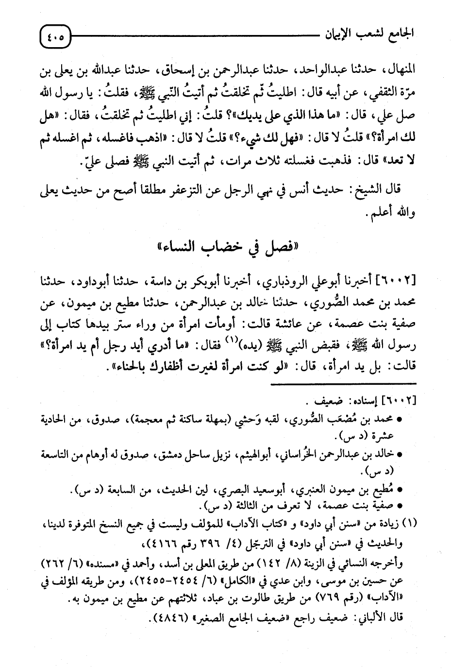 6002 - أَخْبَرَنَا أَبُو عَلِيٍّ الرُّوذْبَارِيُّ، أَنَا أَبُو بَكْرِ بْنُ دَاسَةَ، ثَنَا أَبُو دَاوُدَ، ثَنَا مُحَمَّدُ بْنُ مُحَمَّدٍ الصُّورِيُّ، ثَنَا خَالِدُ بْنُ عَبْدِ الرَّحْمَنِ، ثَنَا مُطِيعُ بْنُ مَيْمُونٍ، عَنْ صَفِيَّةَ بِنْتِ عِصْمَةَ، عَنْ عَائِشَةَ قَالَتْ: أَوْمَأَتِ امْرَأَةٌ مِنْ وَرَاءِ سِتْرٍ بِيَدِهَا كِتَابٌ إِلَى رَسُولِ اللهِ صَلَّى اللَّهُ عَلَيْهِ وَسَلَّمَ فَقَبَضَ النَّبِيُّ صَلَّى اللَّهُ عَلَيْهِ وَسَلَّمَ فَقَالَ: §" مَا أَدْرِي أَيَدُ رَجُلٍ أَمْ يَدُ امْرَأَةٍ؟ " قَالَتْ: بَلْ يَدُ امْرَأَةٍ قَالَ: " لَوْ كُنْتِ امْرَأَةً لَغَيَّرْتِ أَظْفَارَكَ بِالْحِنَّاءِ "