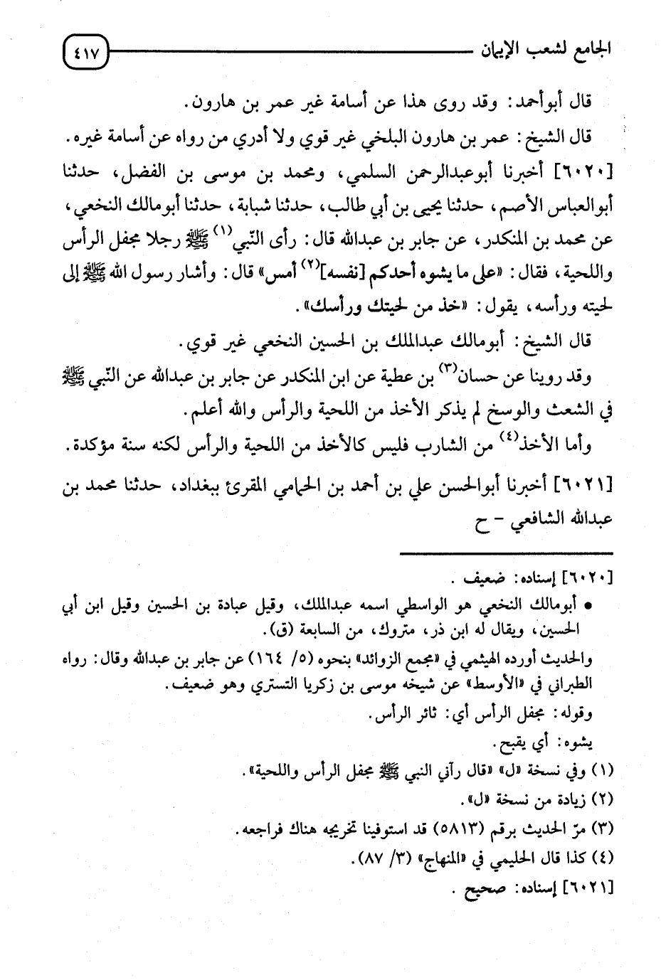 6020 - أَخْبَرَنَا أَبُو عَبْدِ الرَّحْمَنِ السُّلَمِيُّ، وَمُحَمَّدُ بْنُ مُوسَى بْنِ الْفَضْلِ، ثَنَا أَبُو الْعَبَّاسِ الْأَصَمُّ، ثَنَا يَحْيَى بْنُ أَبِي طَالِبٍ، ثَنَا شَبَابَةُ، أَنَا أَبُو مَالِكٍ النَّخَعِيُّ، عَنْ مُحَمَّدِ بْنِ الْمُنْكَدِرِ، عَنْ جَابِرِ بْنِ عَبْدِ اللهِ، قَالَ: رَأَى النَّبِيُّ صَلَّى اللَّهُ عَلَيْهِ وَسَلَّمَ رَجُلًا مُجَفَّلٌ الرَّأْسِ وَاللِّحْيَةِ فَقَالَ: " عَلَى مَا شَوَّهَ أَحَدُكُمْ أَمْسِ؟ " قَالَ: وَأَشَارَ النَّبِيُّ صَلَّى اللَّهُ عَلَيْهِ وَسَلَّمَ إِلَى لِحْيَتِهِ وَرَأْسِهِ يَقُولُ: " §خُذْ مِنْ لِحْيَتِكَ وَرَأْسِكَ " قَالَ الشَّيْخُ: " أَبُو مَالِكٍ عَبْدُ الْمَلِكِ بْنُ الْحُسَيْنِ النَّخَعِيُّ غَيْرُ قَوِيٍّ وَقَدْ رَوَيْنَا عَنْ حَسَّانِ بْنِ عَطِيَّةَ، عَنِ ابْنِ الْمُنْكَدِرِ، عَنْ جَابِرِ بْنِ عَبْدِ اللهِ، عَنِ النَّبِيِّ صَلَّى اللَّهُ عَلَيْهِ وَسَلَّمَ فِي الشَّعَثِ وَالْوَسَخِ لَمْ يَذْكُرِ الْأَخْذَ مِنَ اللِّحْيَةِ وَالرَّأْسِ وَاللهُ أَعْلَمُ، وَأَمَّا الْأَخْذُ مِنَ الشَّارِبِ فَلَيْسَ كَالْأَخْذِ مِنَ اللِّحْيَةِ وَالرَّأْسِ لَكِنَّهُ سُنَّةٌ مُؤَكَّدَةٌ "