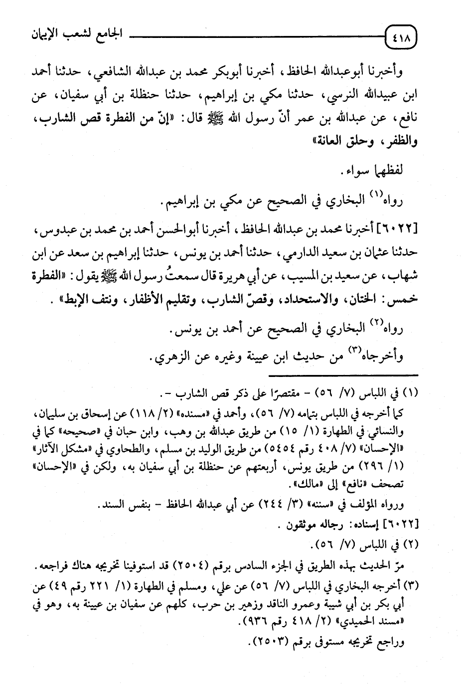 6022 - أَخْبَرَنَا أَبُو عَبْدِ اللهِ مُحَمَّدُ بْنُ عَبْدِ اللهِ الْحَافِظُ، أَنَا أَبُو الْحَسَنِ أَحْمَدُ بْنُ مُحَمَّدِ بْنِ عَبْدُوسٍ، ثَنَا عُثْمَانُ بْنُ سَعِيدٍ الدَّارِمِيُّ، ثَنَا أَحْمَدُ بْنُ يُونُسَ، ثَنَا إِبْرَاهِيمُ بْنُ سَعْدٍ، عَنِ ابْنِ شِهَابٍ، عَنْ سَعِيدِ بْنِ الْمُسَيِّبِ، عَنْ أَبِي هُرَيْرَةَ قَالَ: سَمِعْتُ رَسُولَ اللهِ صَلَّى اللَّهُ عَلَيْهِ وَسَلَّمَ يَقُولُ: §" الْفِطْرَةُ خَمْسٌ الْخِتَانُ وَالِاسْتِحْدَادُ وَقَصُّ الشَّارِبِ وَتَقْلِيمُ الْأَظْفَارِ وَنَتْفُ الْإِبْطِ " رَوَاهُ الْبُخَارِيُّ فِي الصَّحِيحِ عَنْ أَحْمَدَ بْنِ يُونُسَ. وَأَخْرَجَاهُ مِنْ حَدِيثِ ابْنِ عُيَيْنَةَ وَغَيْرِهِ، عَنِ الزُّهْرِيِّ