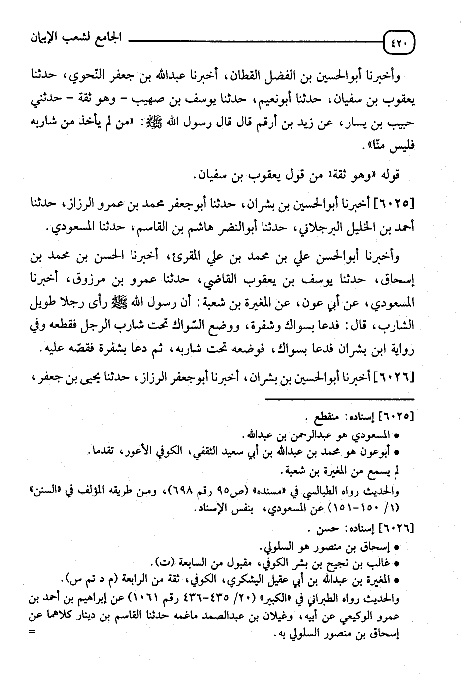 وَأَخْبَرَنَا أَبُو الْحُسَيْنِ بْنُ الْفَضْلِ الْقَطَّانُ، أَنَا عَبْدُ اللهِ بْنُ جَعْفَرٍ النَّحْوِيُّ، ثَنَا يَعْقُوبُ بْنُ سُفْيَانَ، أَنَا أَبُو نُعَيْمٍ، ثَنَا يُوسُفُ بْنُ صُهَيْبٍ وَهُوَ ثِقَةٌ، حَدَّثَنِي حَبِيبُ بْنُ يَسَارٍ، عَنْ زَيْدِ بْنِ أَرْقَمَ قَالَ: قَالَ رَسُولُ اللهِ صَلَّى اللَّهُ عَلَيْهِ وَسَلَّمَ: §" مَنْ لَمْ يَأْخُذْ شَارِبَهُ فَلَيْسَ مِنَّا " قَوْلٌ وَهُوَ ثِقَةٌ مِنْ قَوْلِ يَعْقُوبَ بْنِ سُفْيَانَ