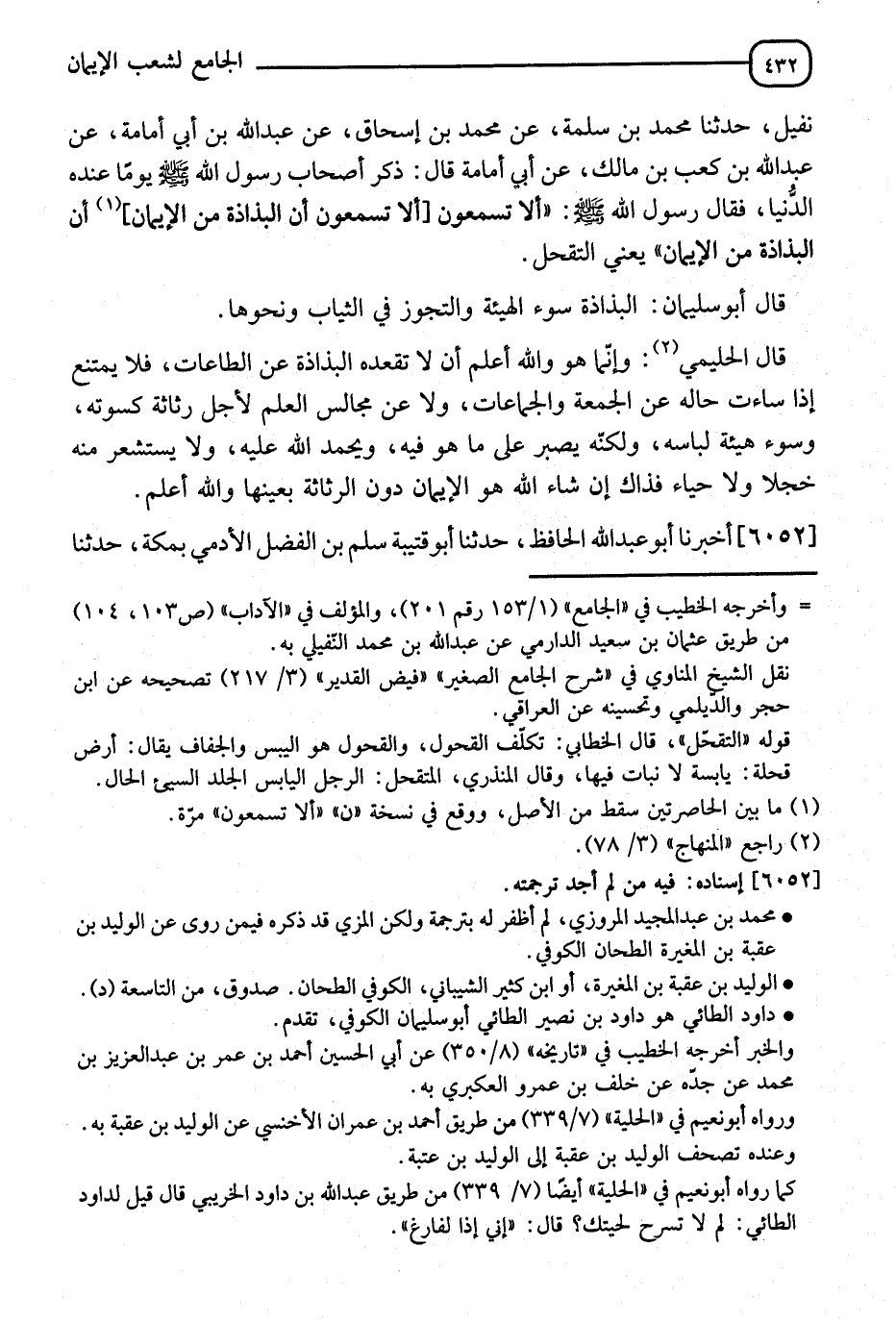 6052 - أَخْبَرَنَا أَبُو عَبْدِ اللهِ الْحَافِظُ، ثَنَا أَبُو قُتَيْبَةَ سَالِمُ بْنُ الْفَضْلِ الْآدَمِيُّ، بِمَكَّةَ، ثَنَا -[433]- خَلَفُ بْنُ عَمْرٍو الْعُكْبَرِيُّ، ثَنَا مُحَمَّدُ بْنُ عَبْدِ الْحَمِيدِ الْمَرْوَزِيُّ، ثَنَا الْوَلِيدُ بْنُ عُتْبَةَ قَالَ: " رَأَيْتُ دَاوُدَ الطَّائِيَّ وَقَالَ لَهُ رَجُلٌ: §أَلَا تُسَرِّحُ لِحْيَتَكَ؟ قَالَ: إِنِّي عَنْهُ مَشْغُولٌ "